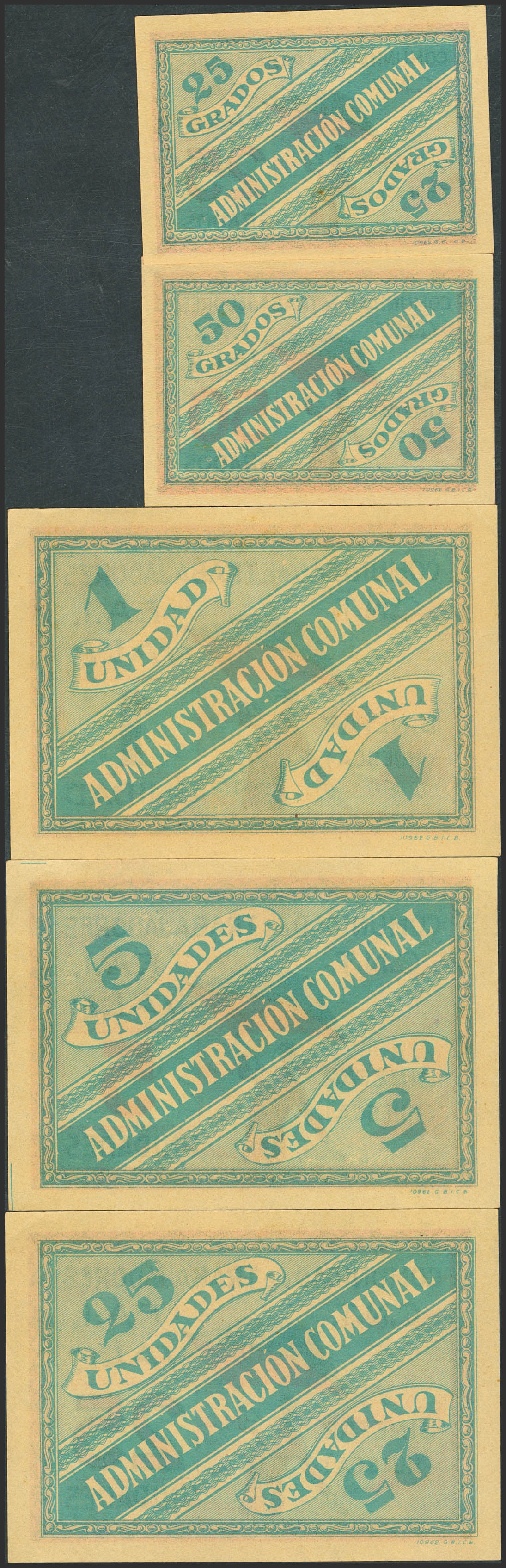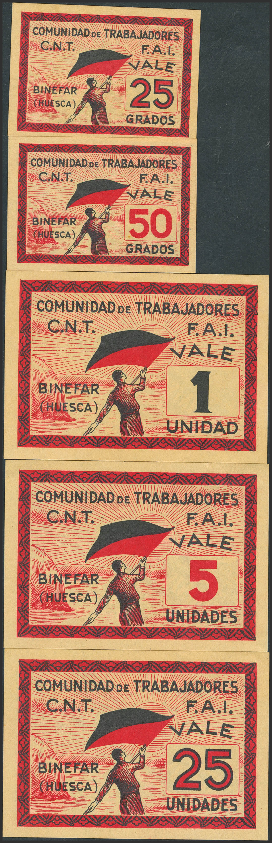 BINEFAR (HUESCA). 25 Grados, 50 Grados, 1 Unidad, 5 Unidades y 25 Unidades. (1937ca). (González: 1217/21). Rarísima serie completa, especialmente en esta excepcional calidad. SC-.