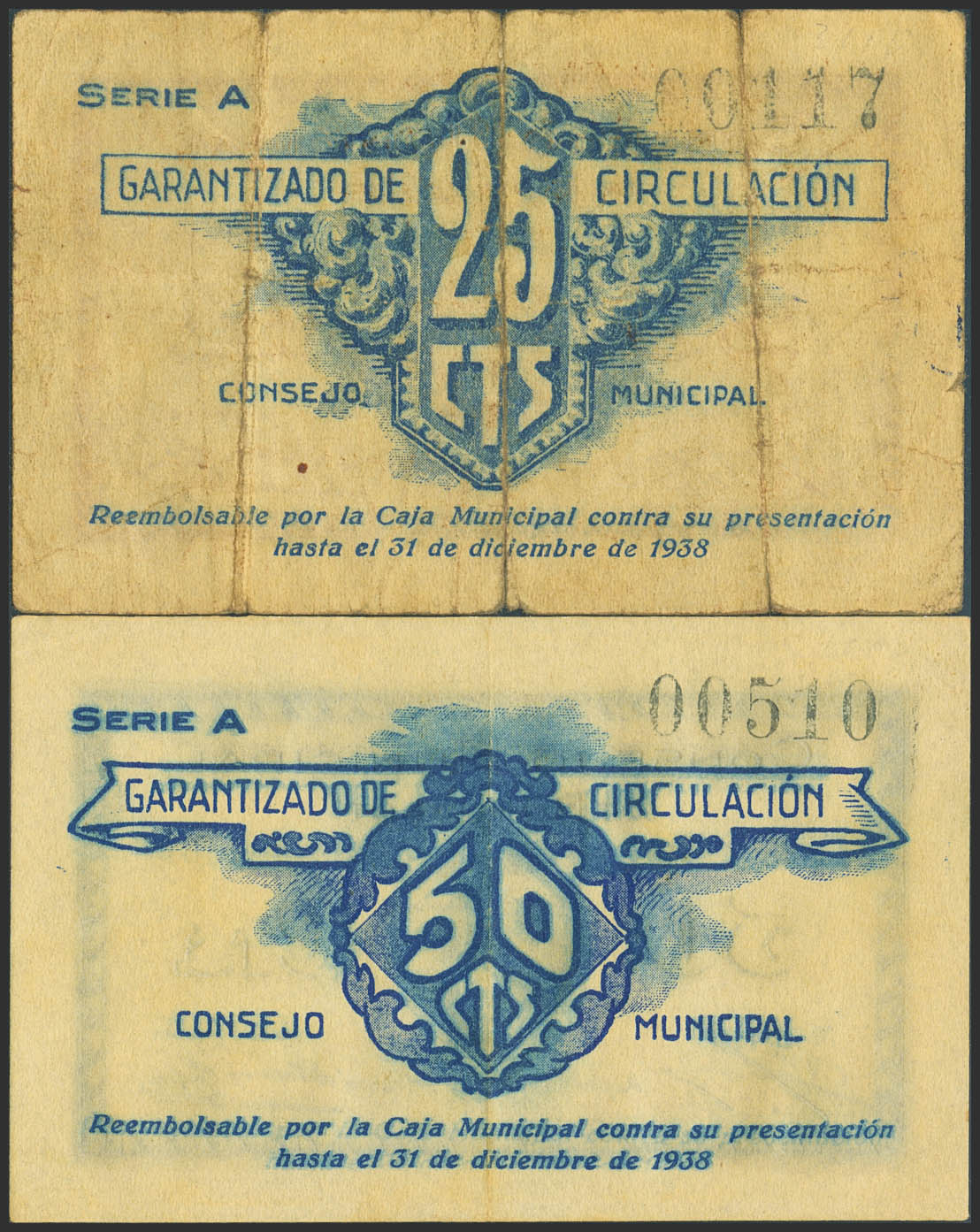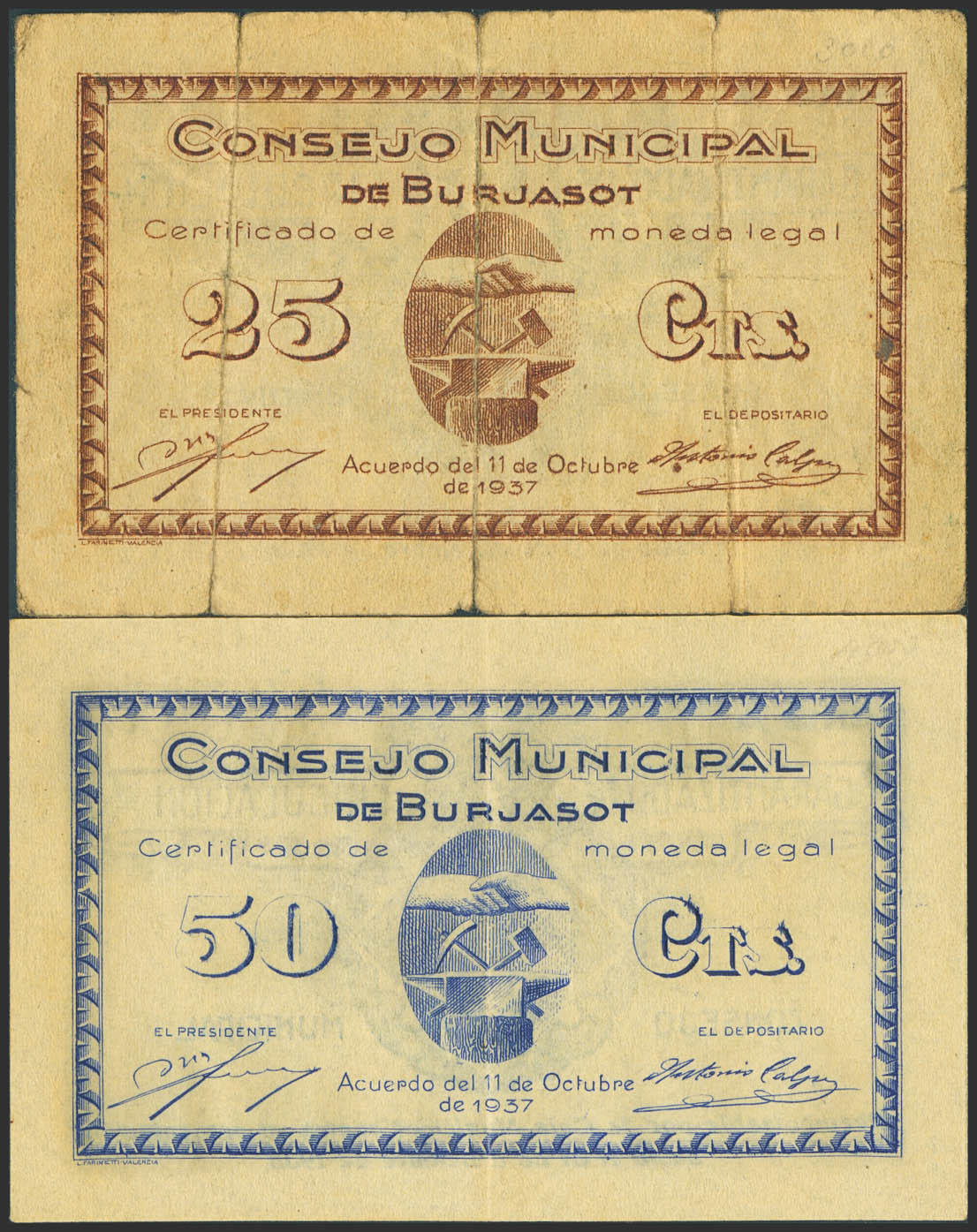 BURJASOT (VALENCIA). 25 Céntimos y 50 Céntimos. 11 de Octubre de 1937. Serie A, ambos. (González: 1328, 1329). Inusuales. MBC-.