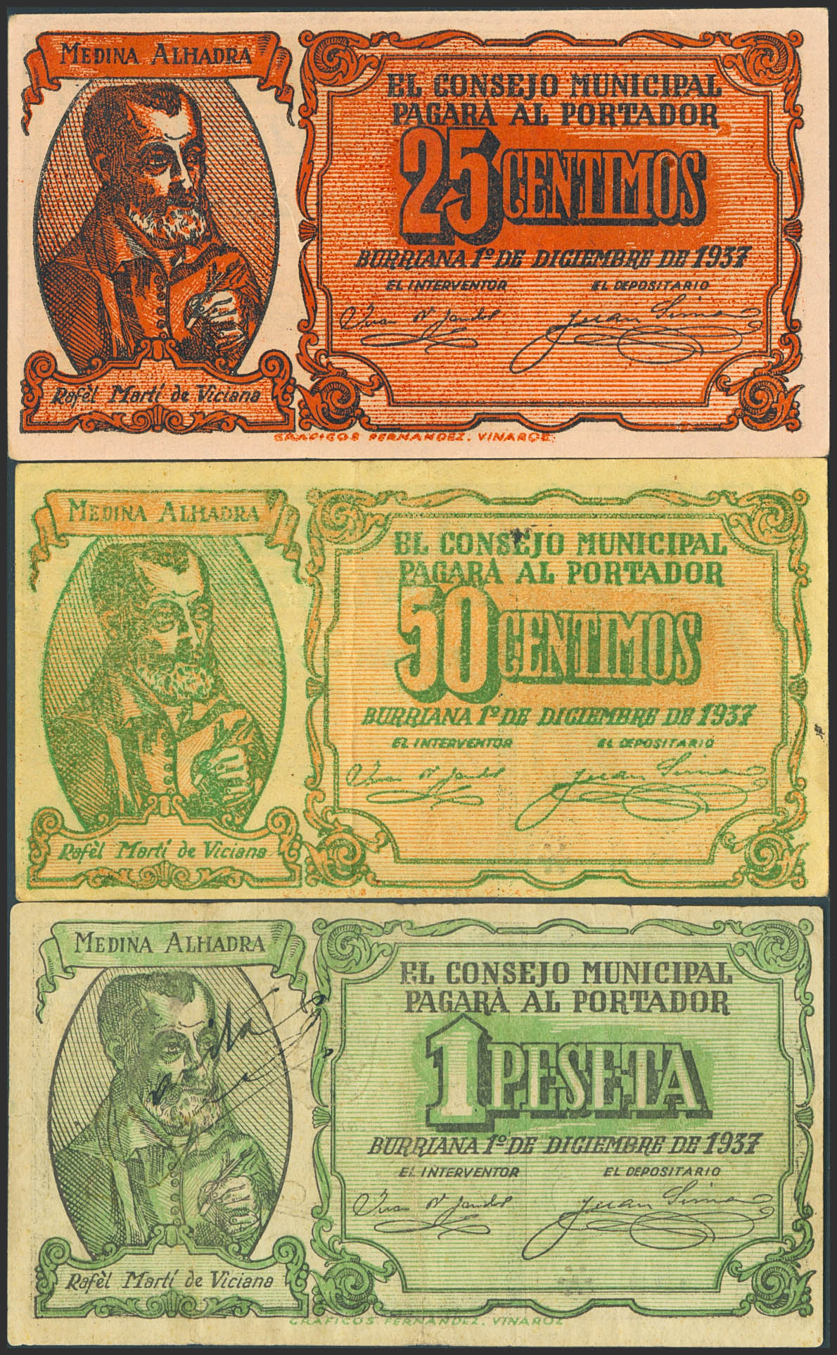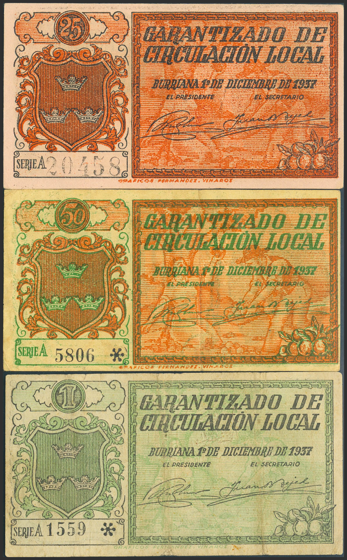 BURRIANA (CASTELLON). 25 Céntimos, 50 Céntimos y 1 Peseta. 1 de Diciembre de 1937. Serie A, todos. (González: 1335/37). Inusual serie completa. SC-/MBC+.