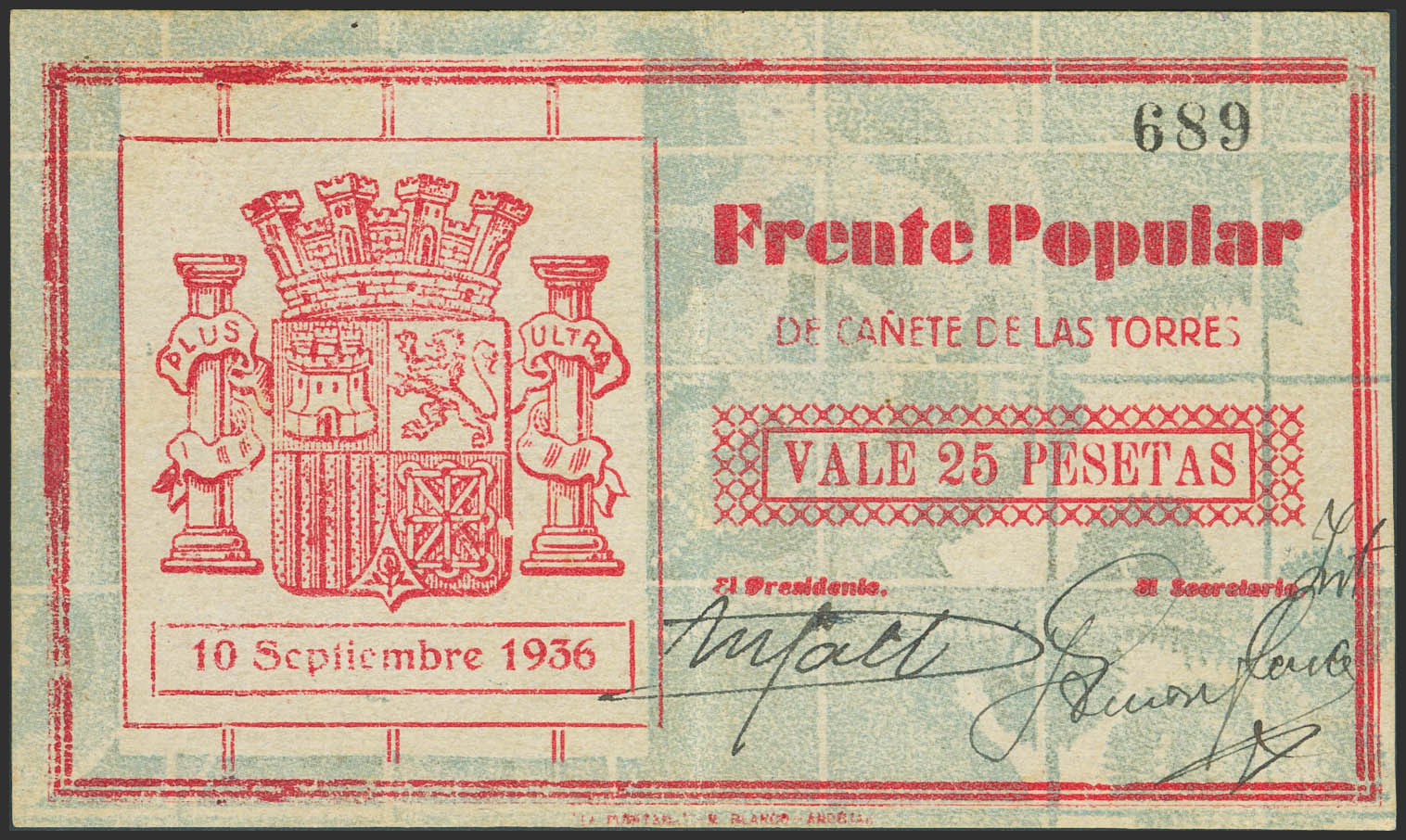 CAÑETE DE LAS TORRES (CORDOBA). 25 Pesetas. 10 de Septiembre de 1936. ¿Numeración póstuma?. (González: 1597). Muy raro. EBC-.