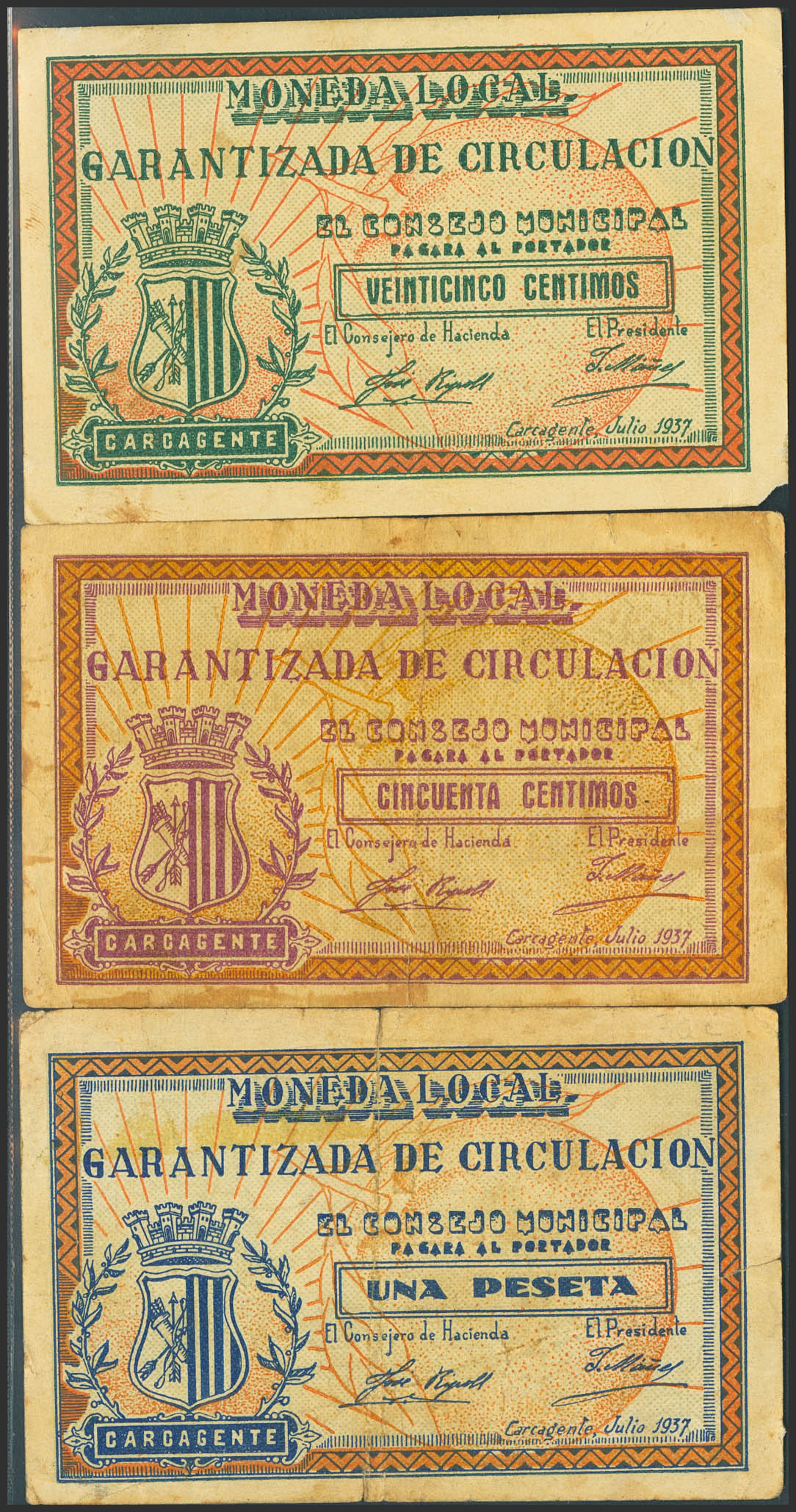 CARCAGENTE (VALENCIA). 25 Céntimos, 50 Céntimos y 1 Peseta. Julio de 1937. (González: 1633/35). Inusual serie completa. MBC.