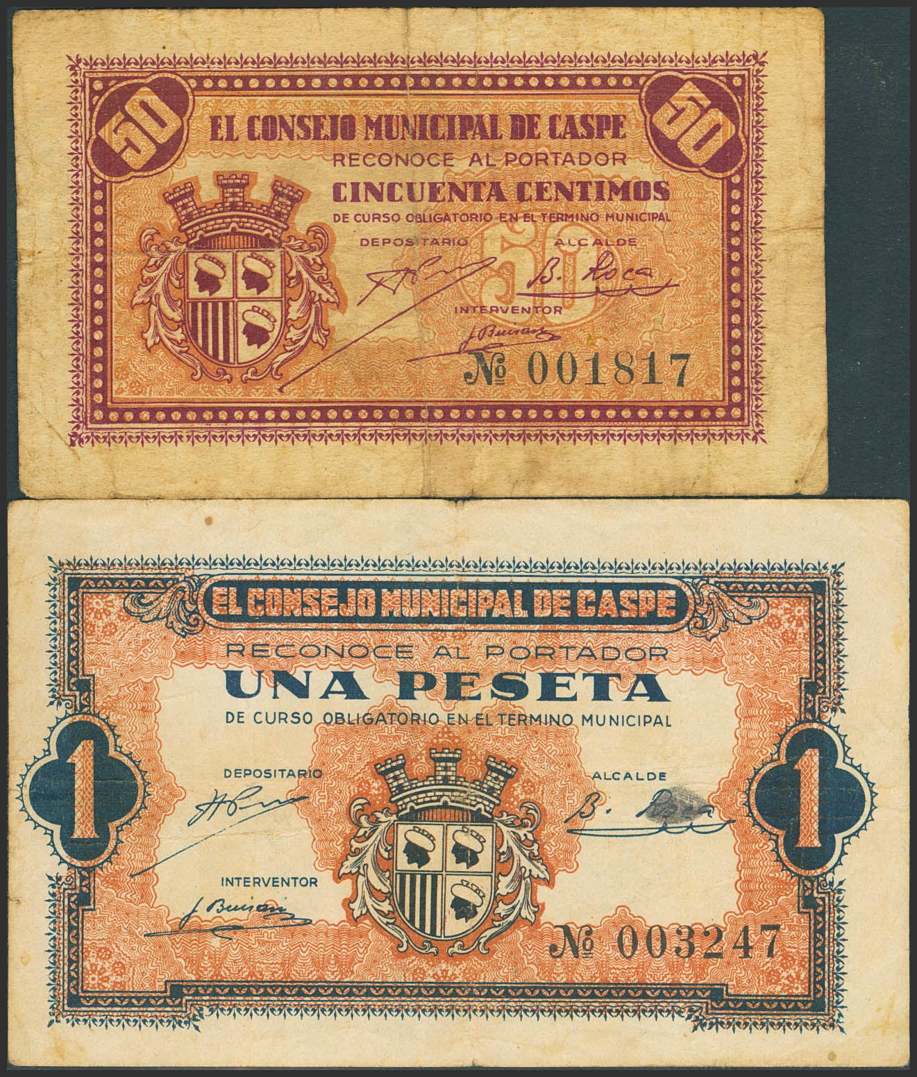 CASPE (ZARAGOZA). 50 Céntimos y 1 Peseta. (1937ca). (González: 1738/39). Serie completa. MBC.