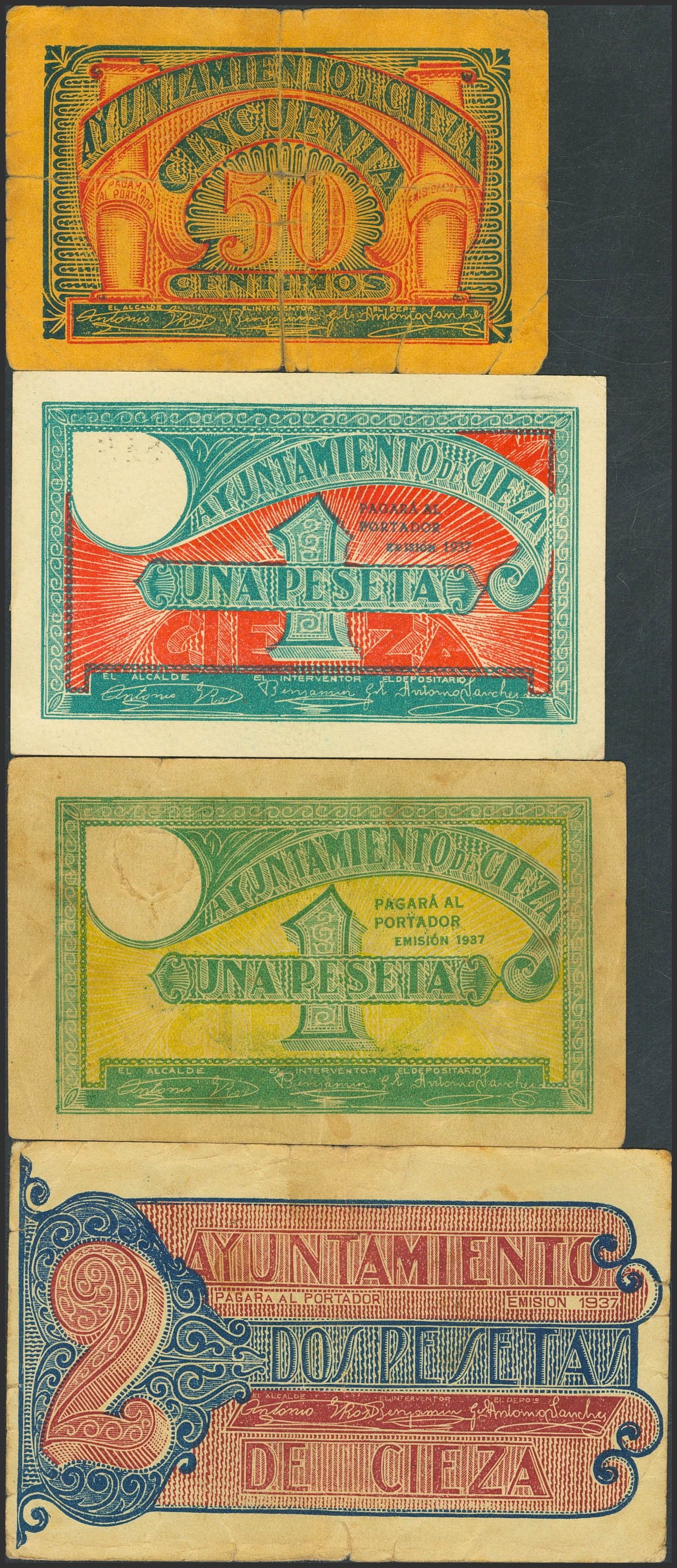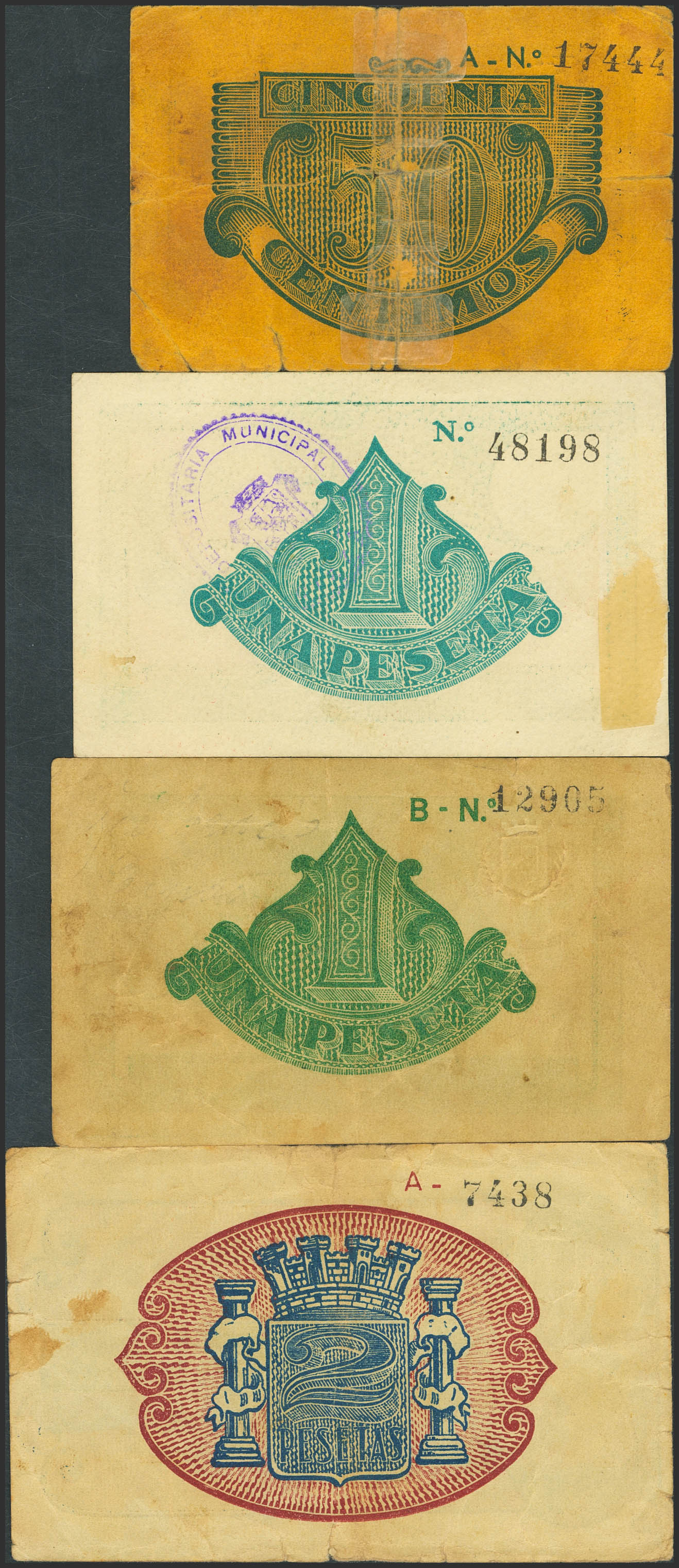 CIEZA (MURCIA). 50 Céntimos, 1 Peseta (2) y 2 Pesetas. (1937ca). Serie A, sin serie, series B y A, respectivamente. (González: 1960/62). Inusual serie completa. EBC+++/BC+.