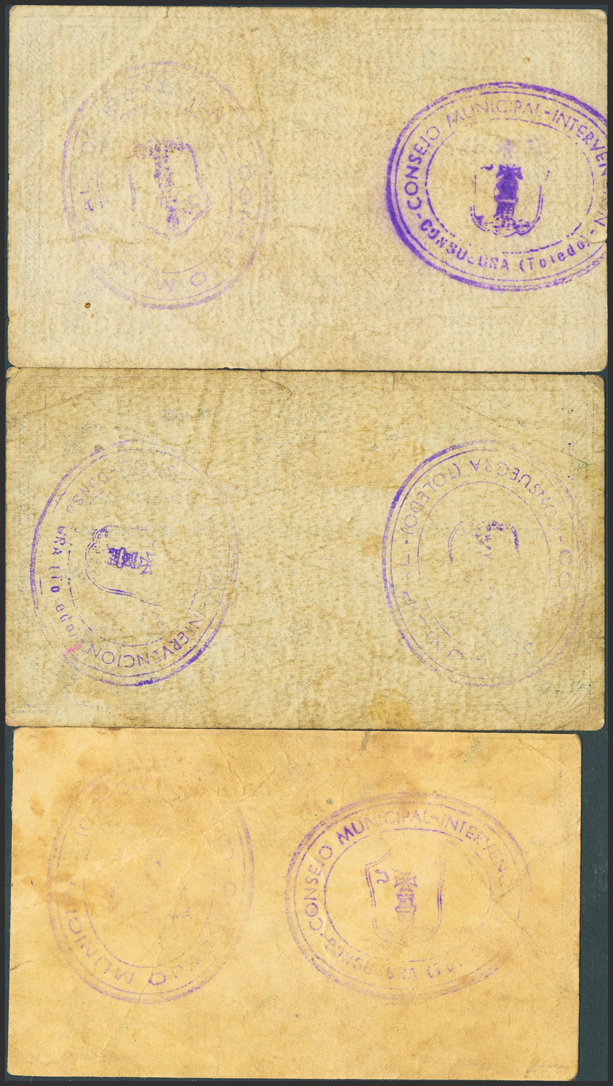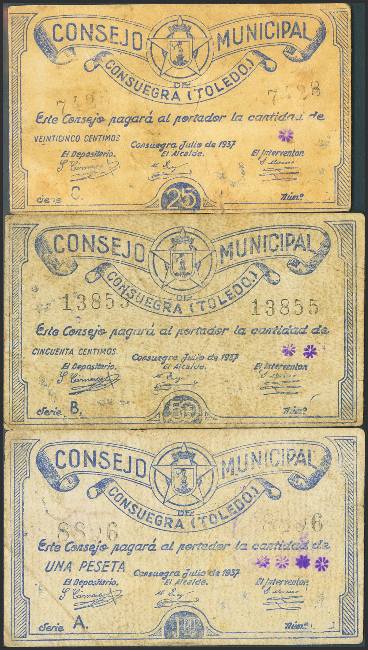 CONSUEGRA (TOLEDO). 25 Céntimos, 50 Céntimos y 1 Peseta. Julio de 1937. Serie C, B y A, respectivamente. (González: 2031/33). Muy rara serie completa, para hacernos a idea de la rareza el billete de 1 pts no esta fotografíado en González. MBC-.
