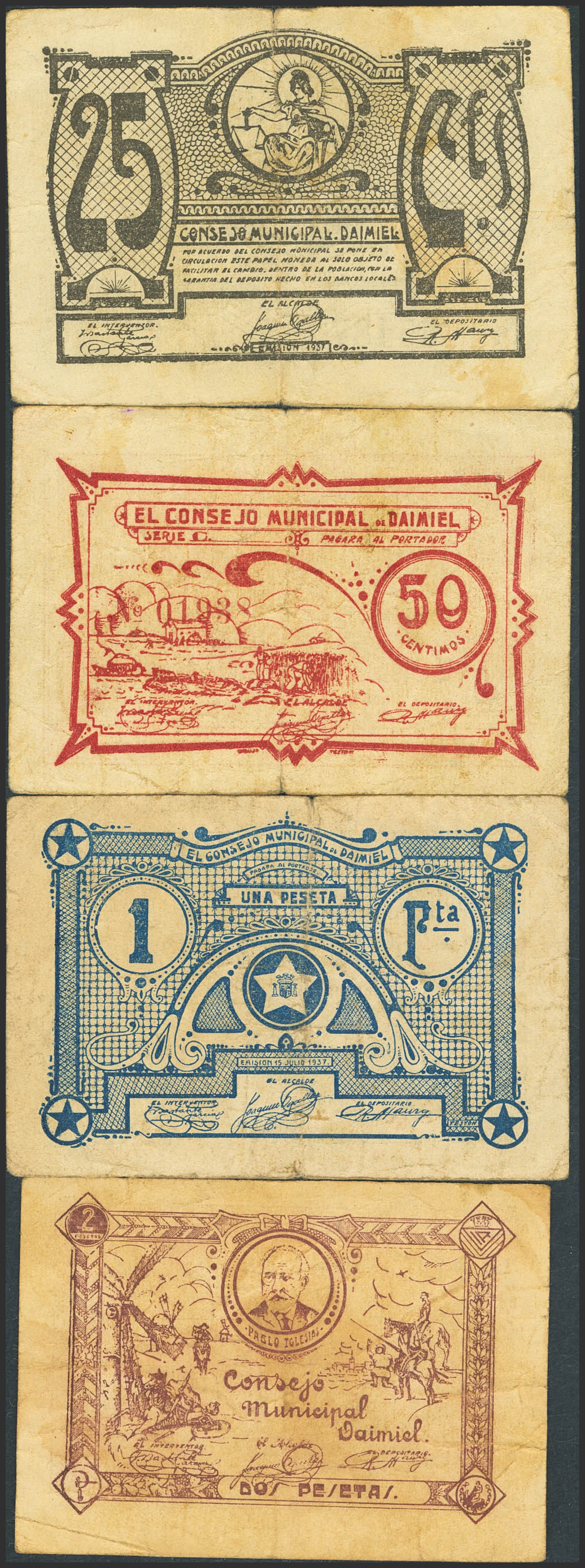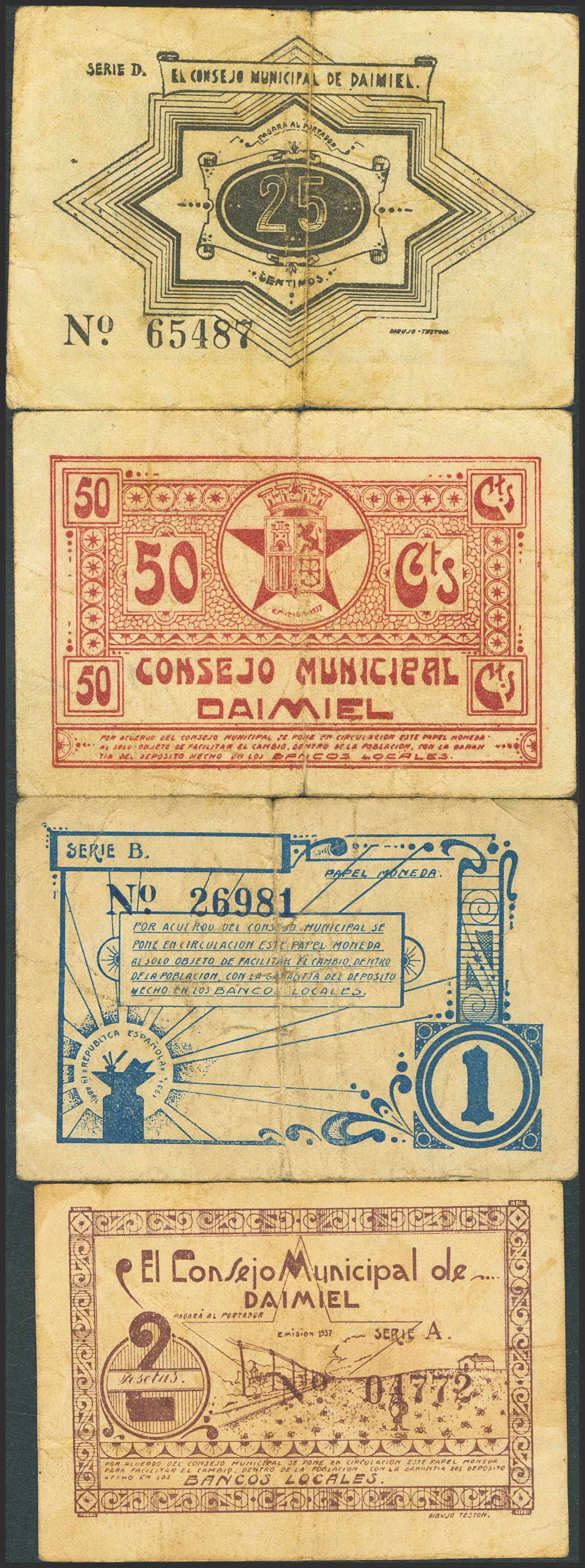 DAIMIEL (CIUDAD REAL). 25 Céntimos, 50 Céntimos, 1 Peseta y 2 Pesetas. 1937. Serie D, C, B y A, respectivamente. (González: 2175/78). Rara serie completa. MBC.