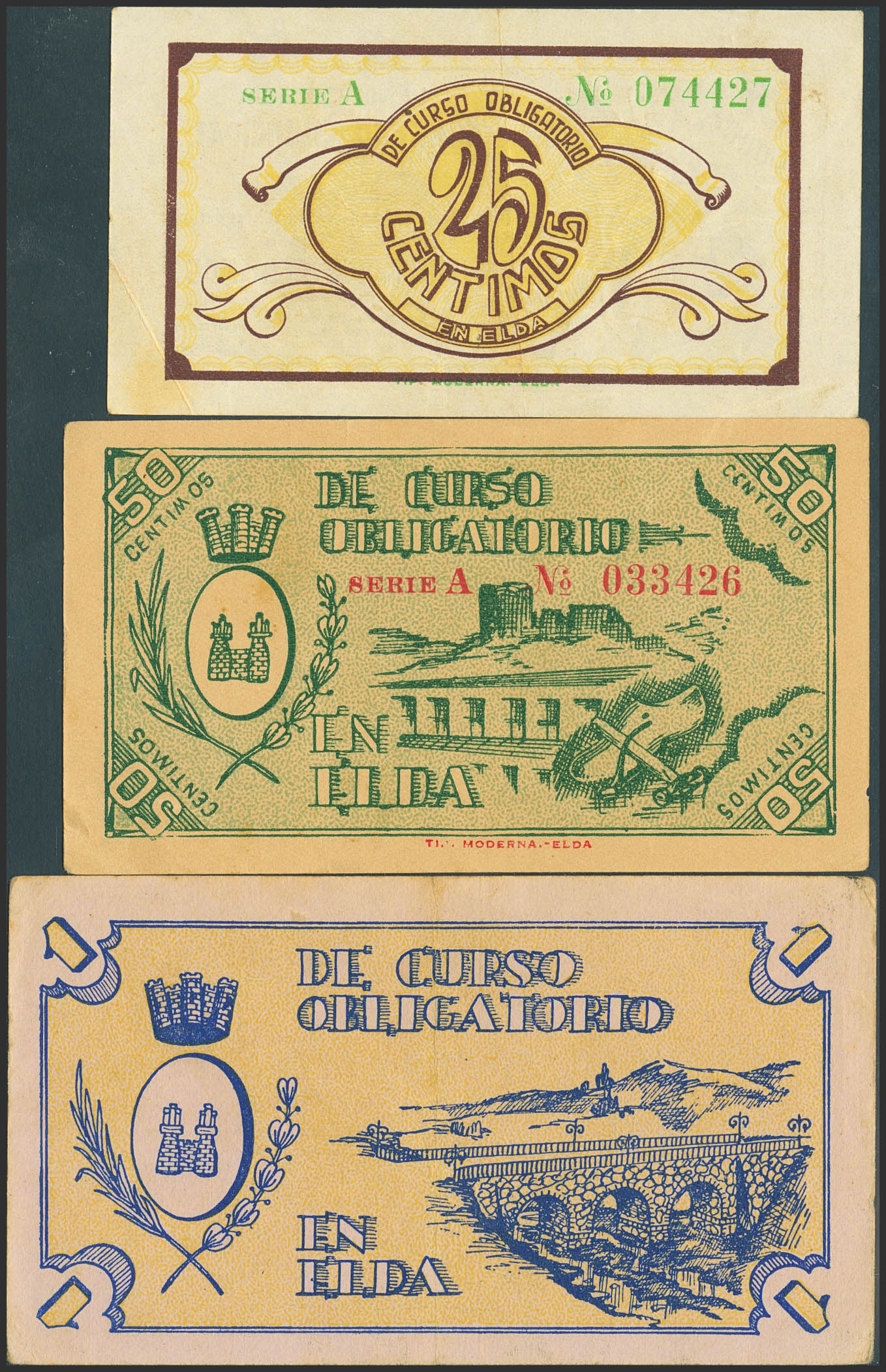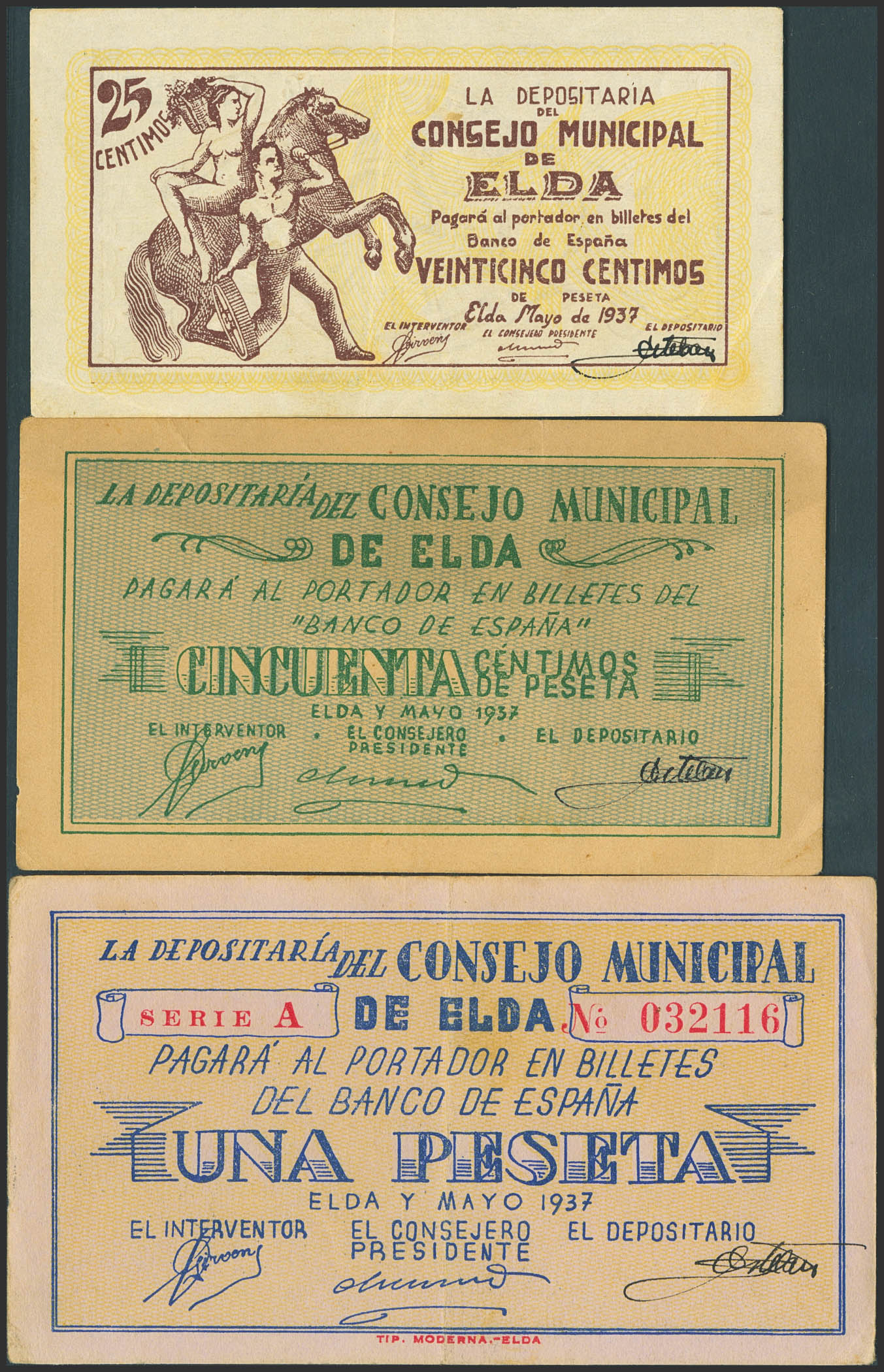 ELDA (ALICANTE). 25 Céntimos, 50 Céntimos y 1 Peseta. Mayo de 1937. Serie A, todos. (González: 2291/93). Inusual serie completa. MBC/EBC.