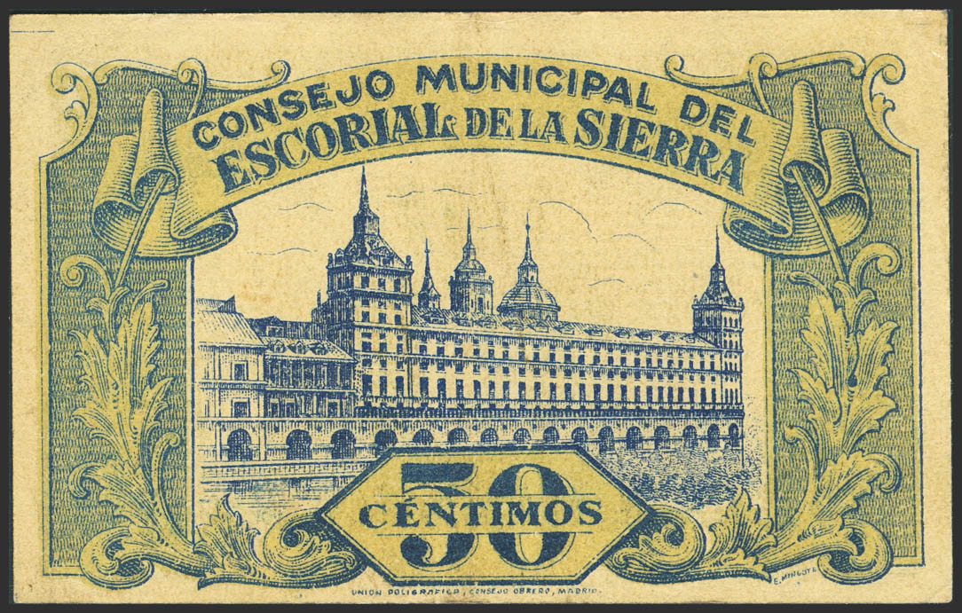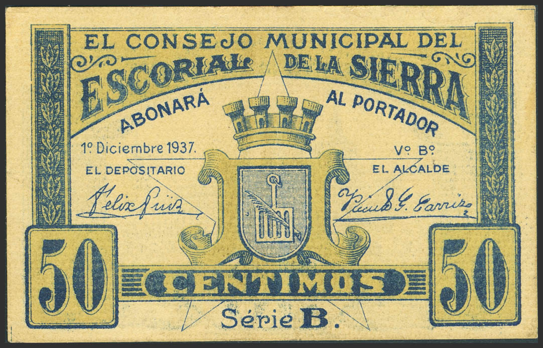 ESCORIAL DE LA SIERRA (MADRID). 50 Céntimos. 1 de Diciembre de 1937. Serie B. (González: 2325). Inusual. MBC.
