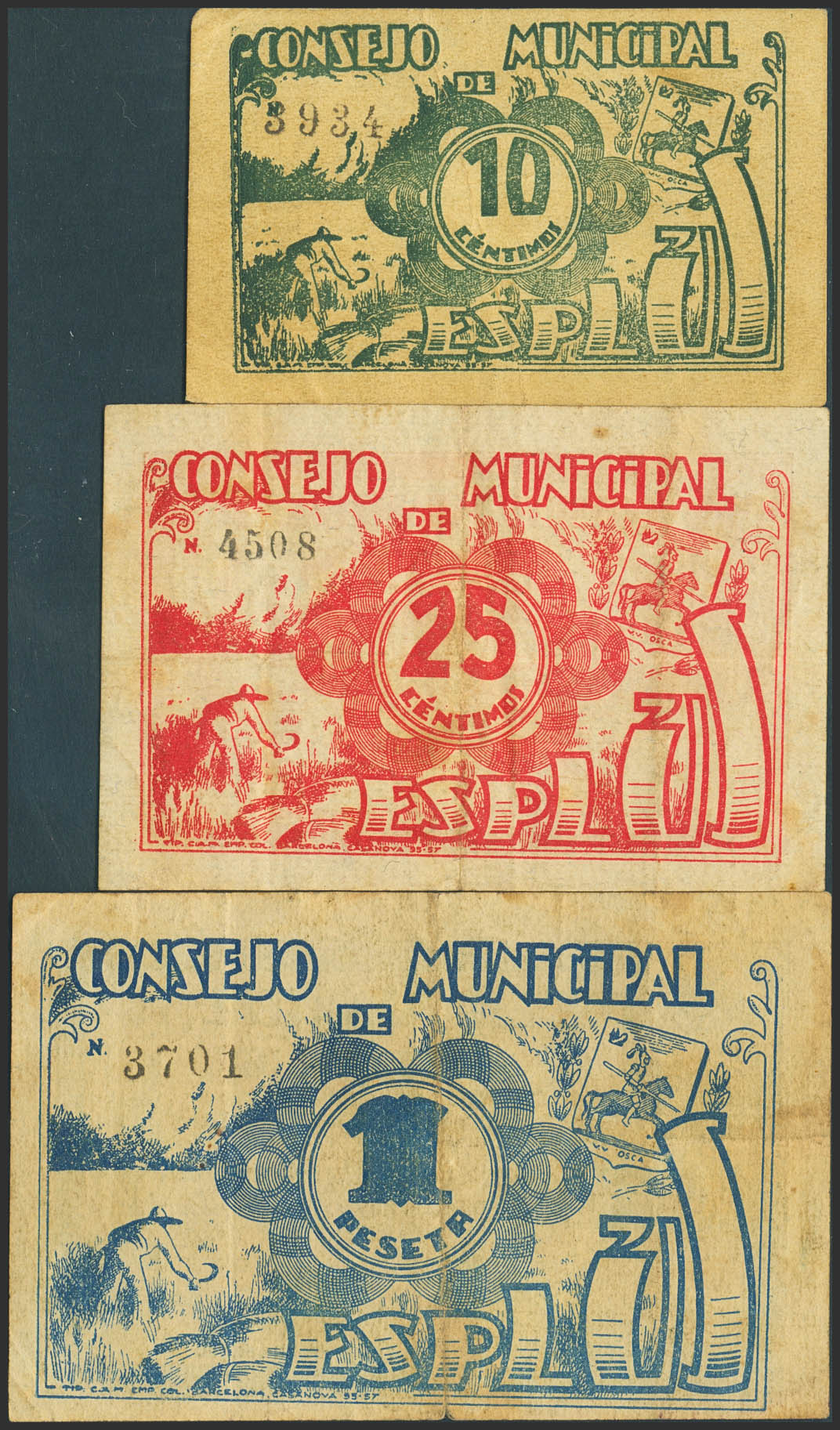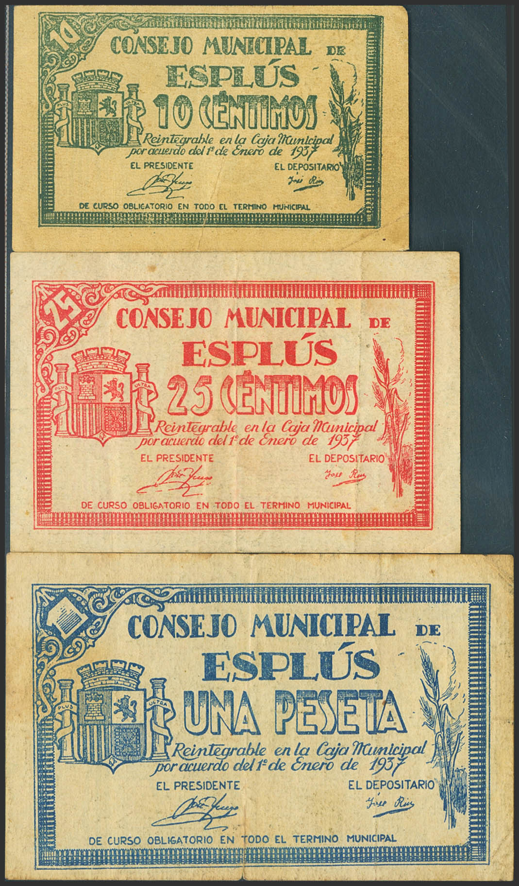 ESPLUS (HUESCA). 20 Céntimos, 25 Céntimos y 1 Peseta. 1 de Enero de 1938. (González: 2344, 2345, 2347). Inusuales. MBC.