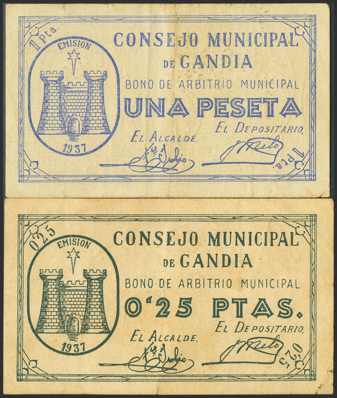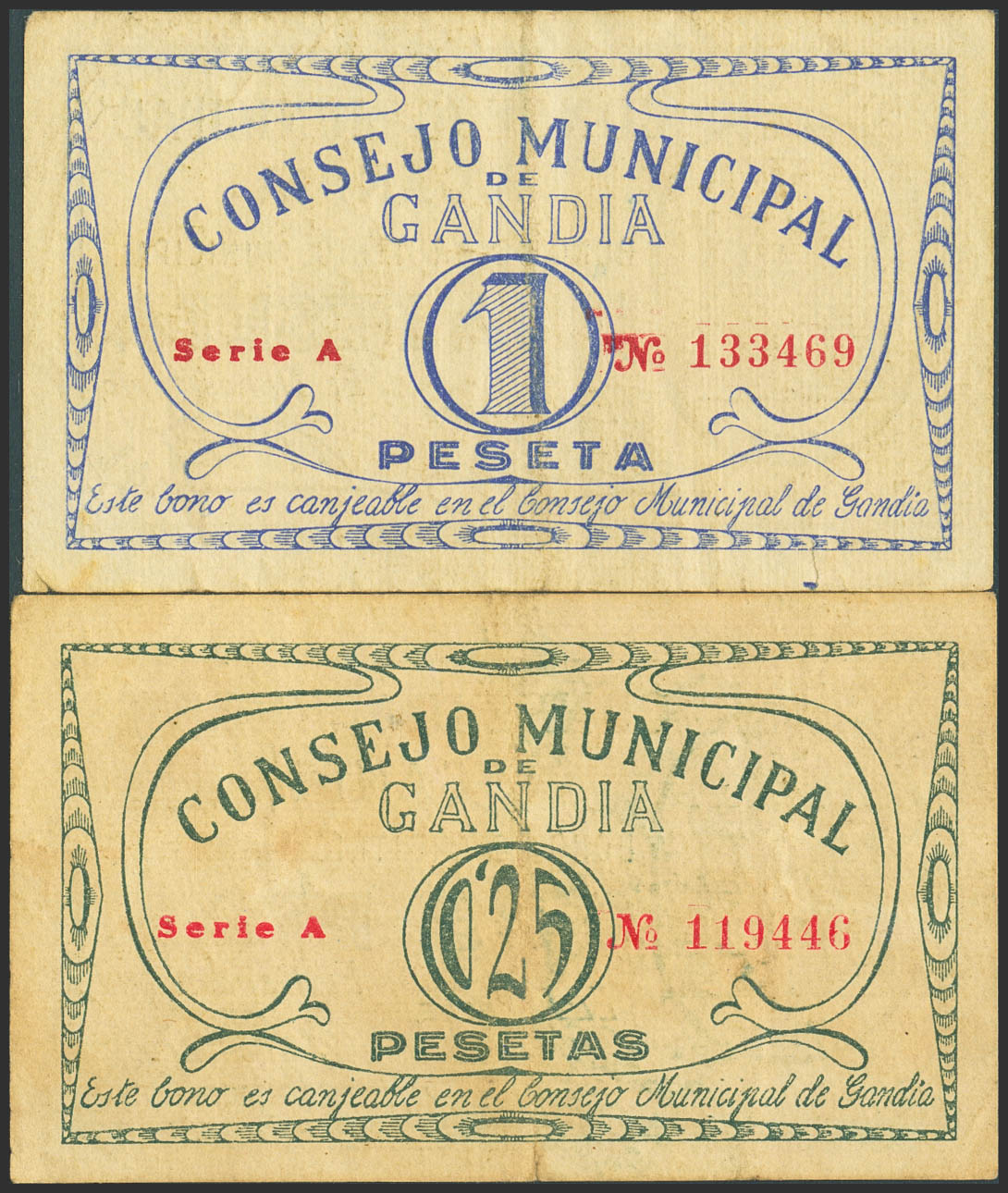 GANDIA (VALENCIA). 25 Céntimos y 1 Peseta. 1937. Serie A, ambos. (González: 2610/11). Serie completa. MBC.
