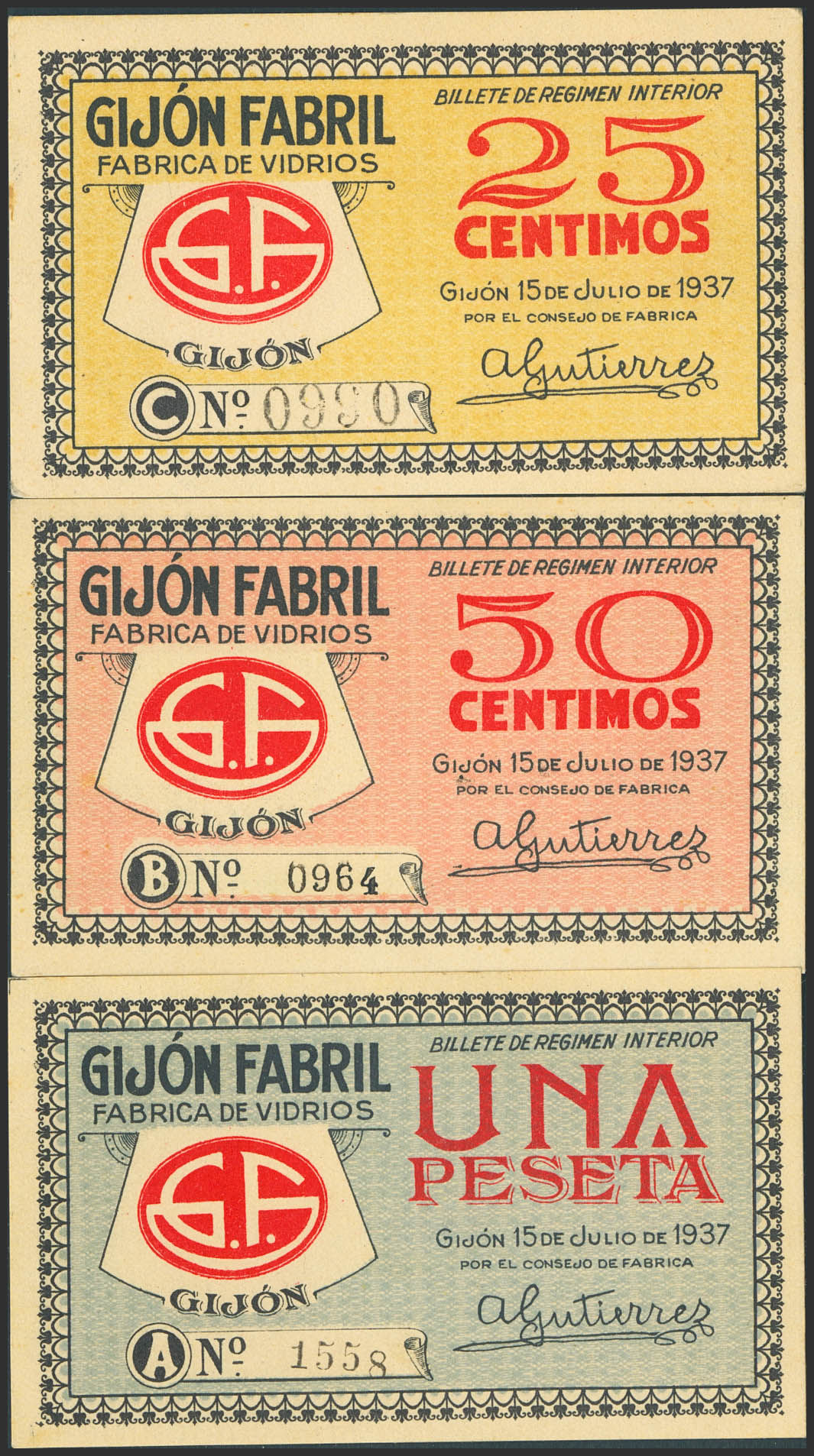 GIJON (ASTURIAS). 25 Céntimos, 50 Céntimos y 1 Peseta. 15 de Julio de 1937. (González: 2659/61). Rara serie completa, especialmente en esta conservación. SC/SC-.