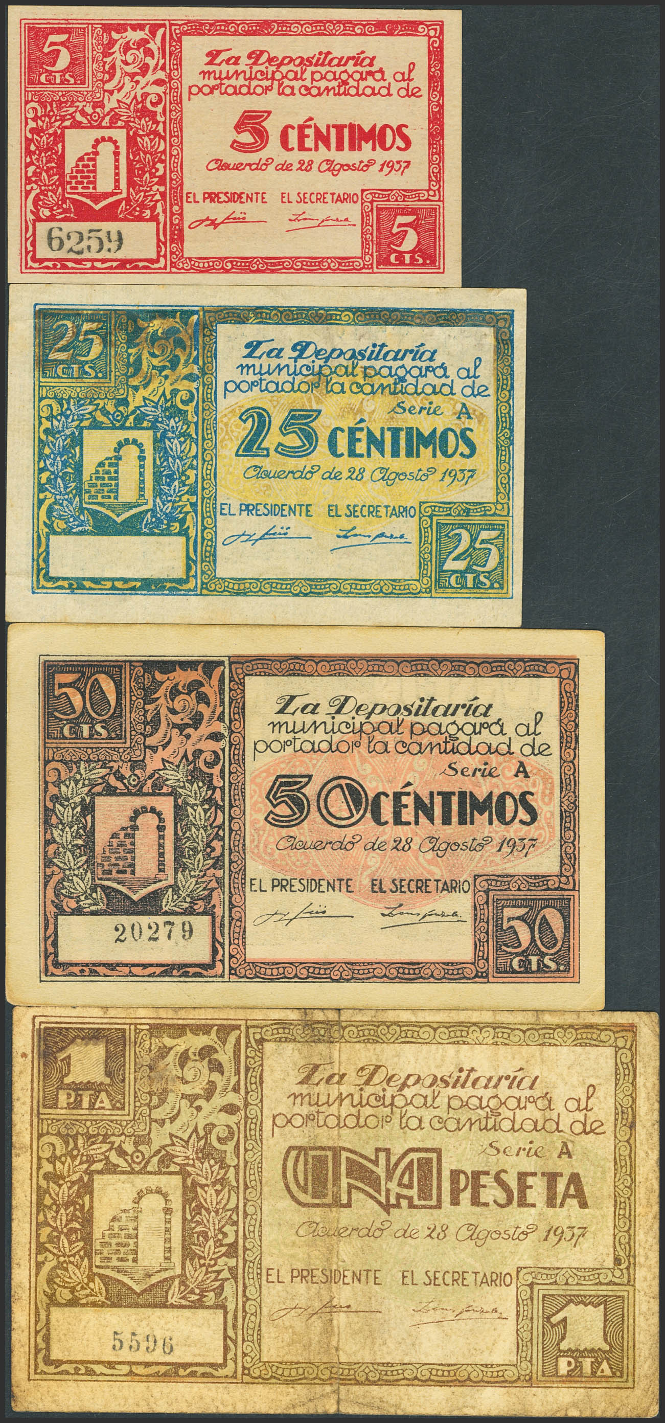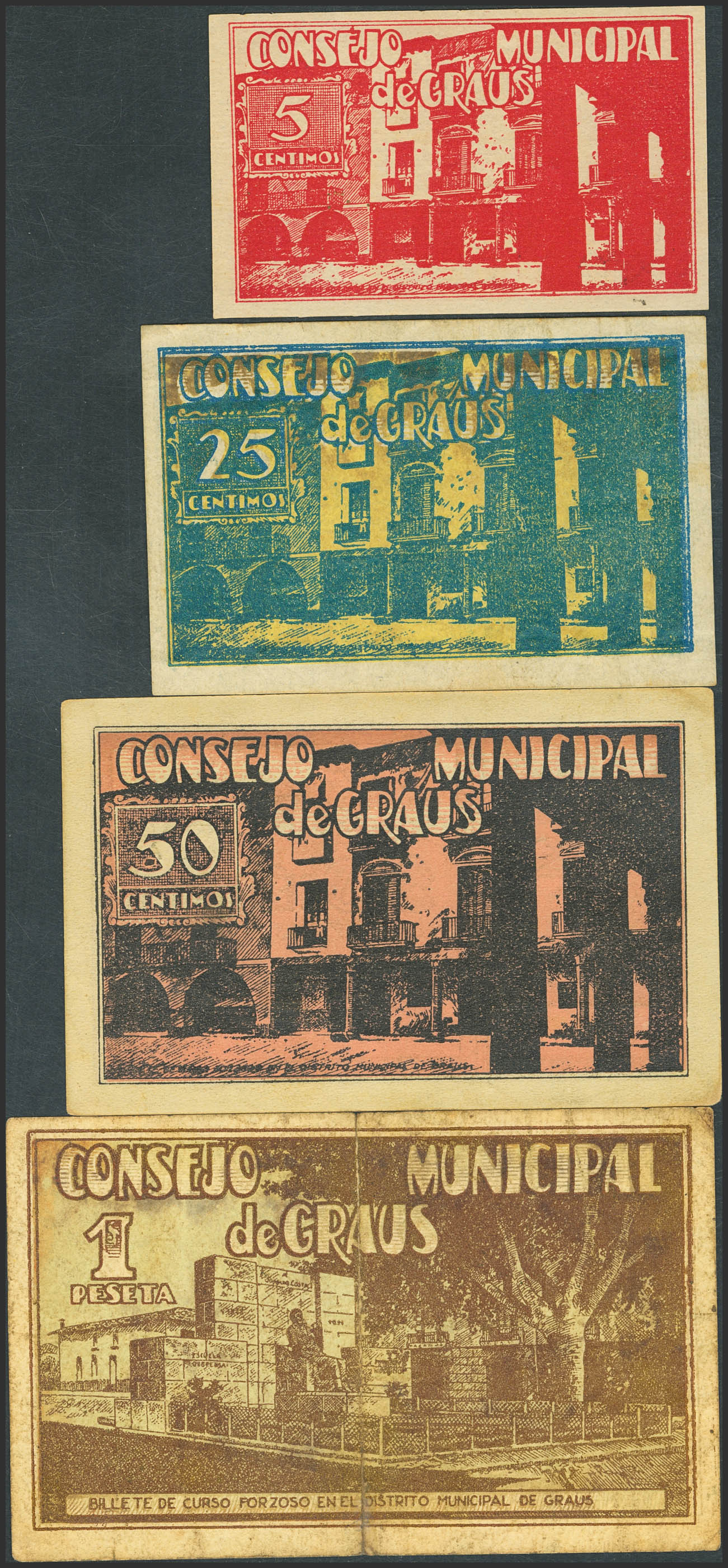 GRAUS (HUESCA). 5 Céntimos, 25 Céntimos, 50 Céntimos y 1 Peseta. 28 de Agosto de 1937. (González: 2726/29). Serie completa, 50 cts mismo ejemplar que el fotografiado en González. SC--/MBC.