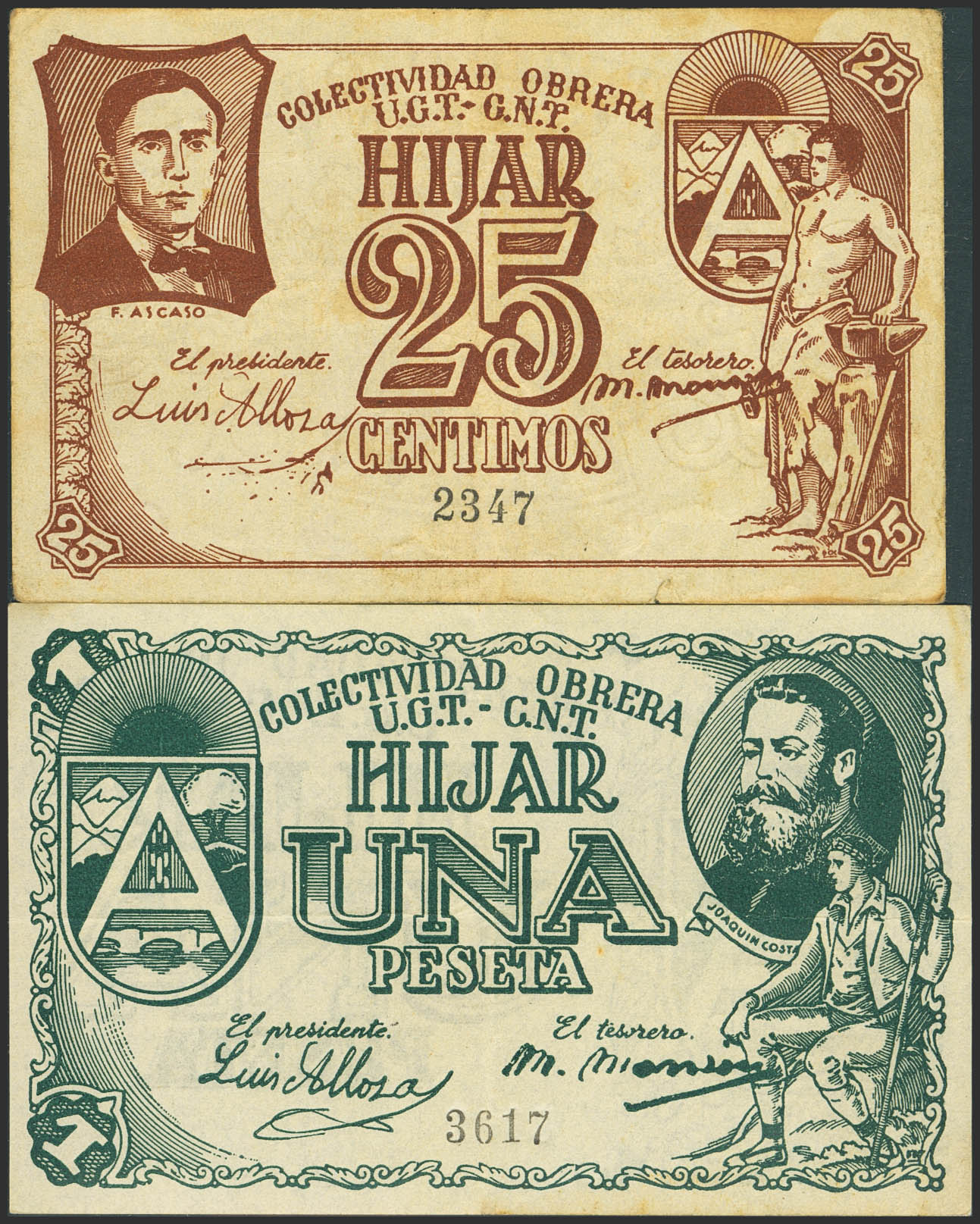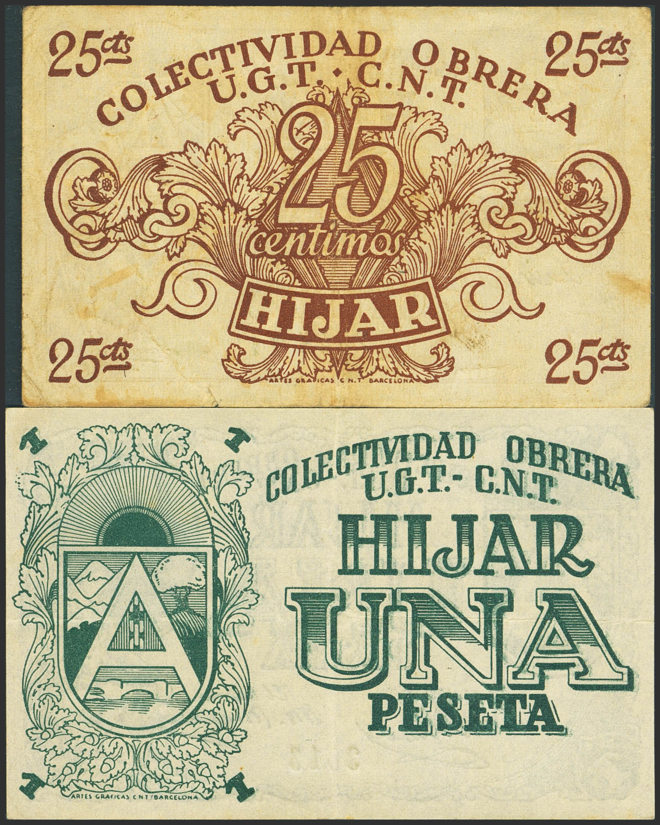 HIJAR (TERUEL). 25 Céntimos y 1 Peseta. (1937ca). (González: 2849/50). Serie completa. MBC+/MBC-.