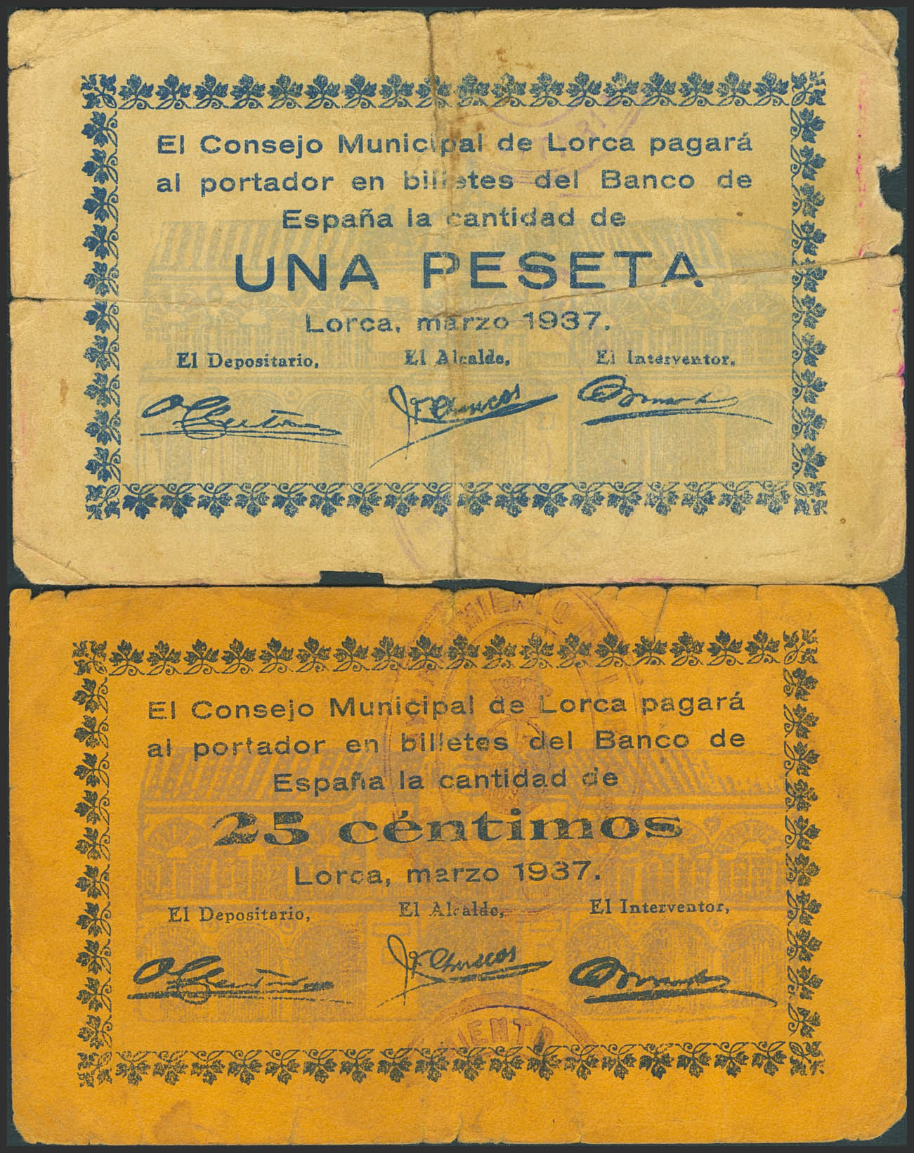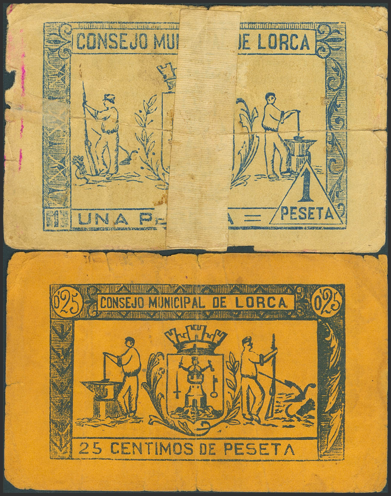 LORCA (MURCIA). 25 Céntimos y 1 Peseta. Marzo de 1937. (González: 8229/30). Inusual serie completa. RC/BC.