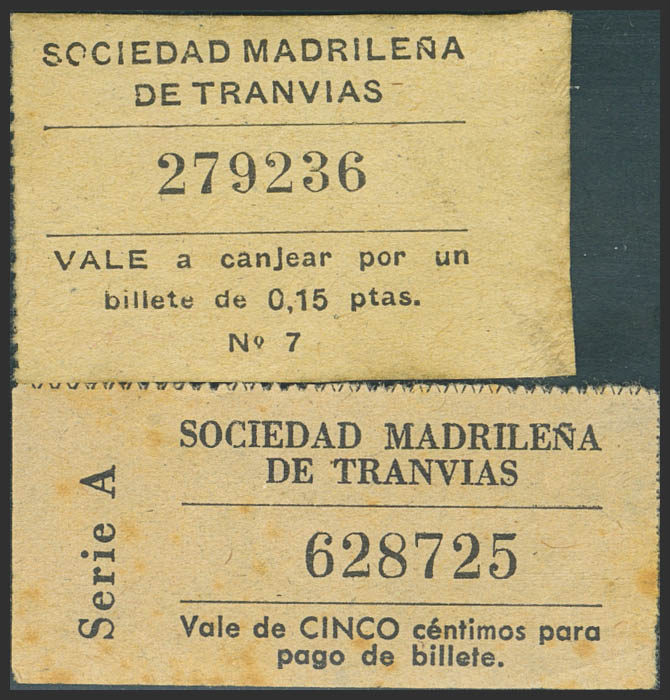 MADRID (TRANVIAS). 5 Céntimos y 15 Céntimos. (1937ca). (González: No catalogados). Rarísimos, para hacernos a la idea de la rareza, en el catálogo de González no estan mencionados y estos mismos fueron subastados por Aureo en 2023. MBC.