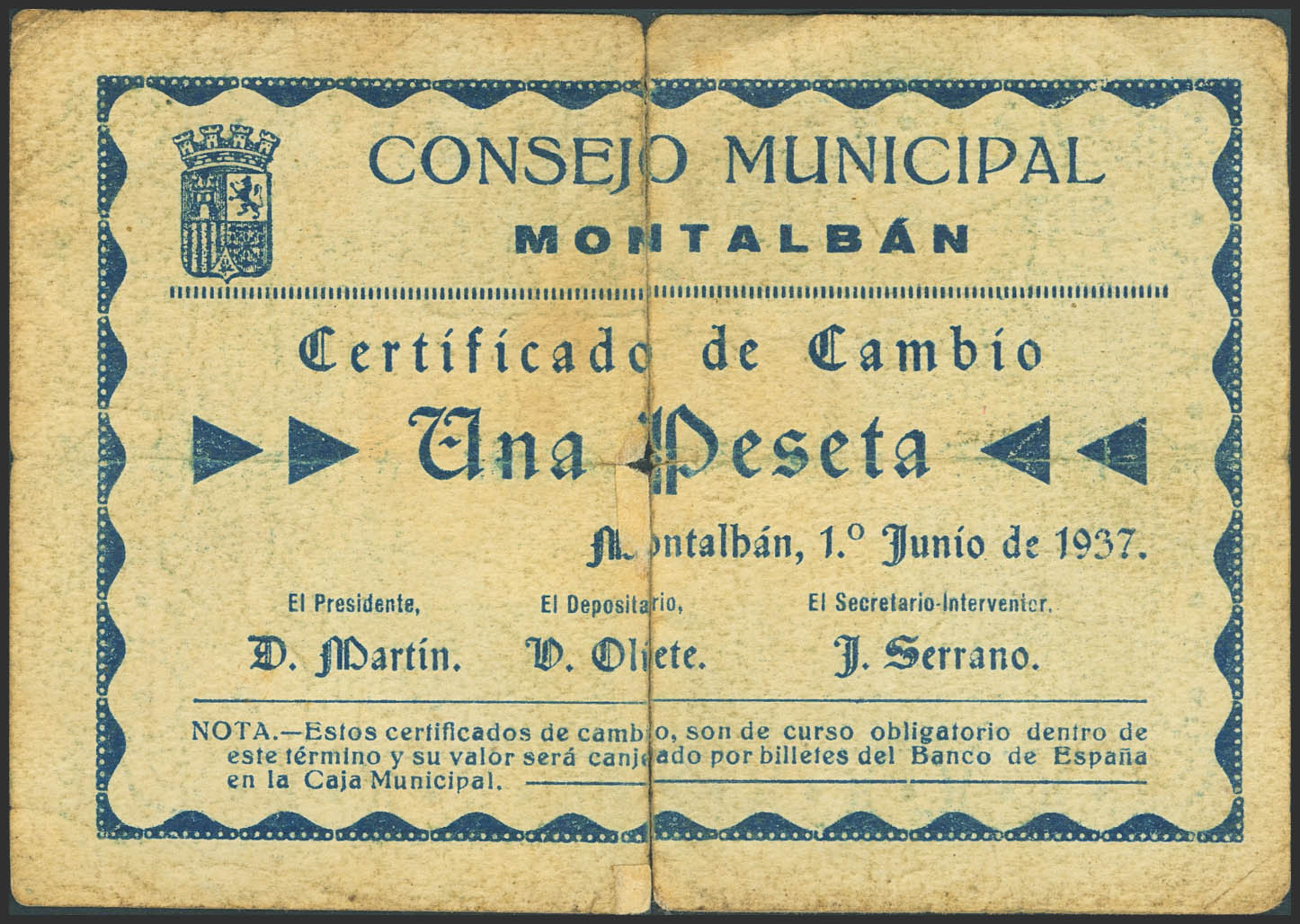 MONTALBAN (TERUEL). 1 Peseta. 1 de Junio de 1937. Serie A. (González: 3619). Muy raro. BC.