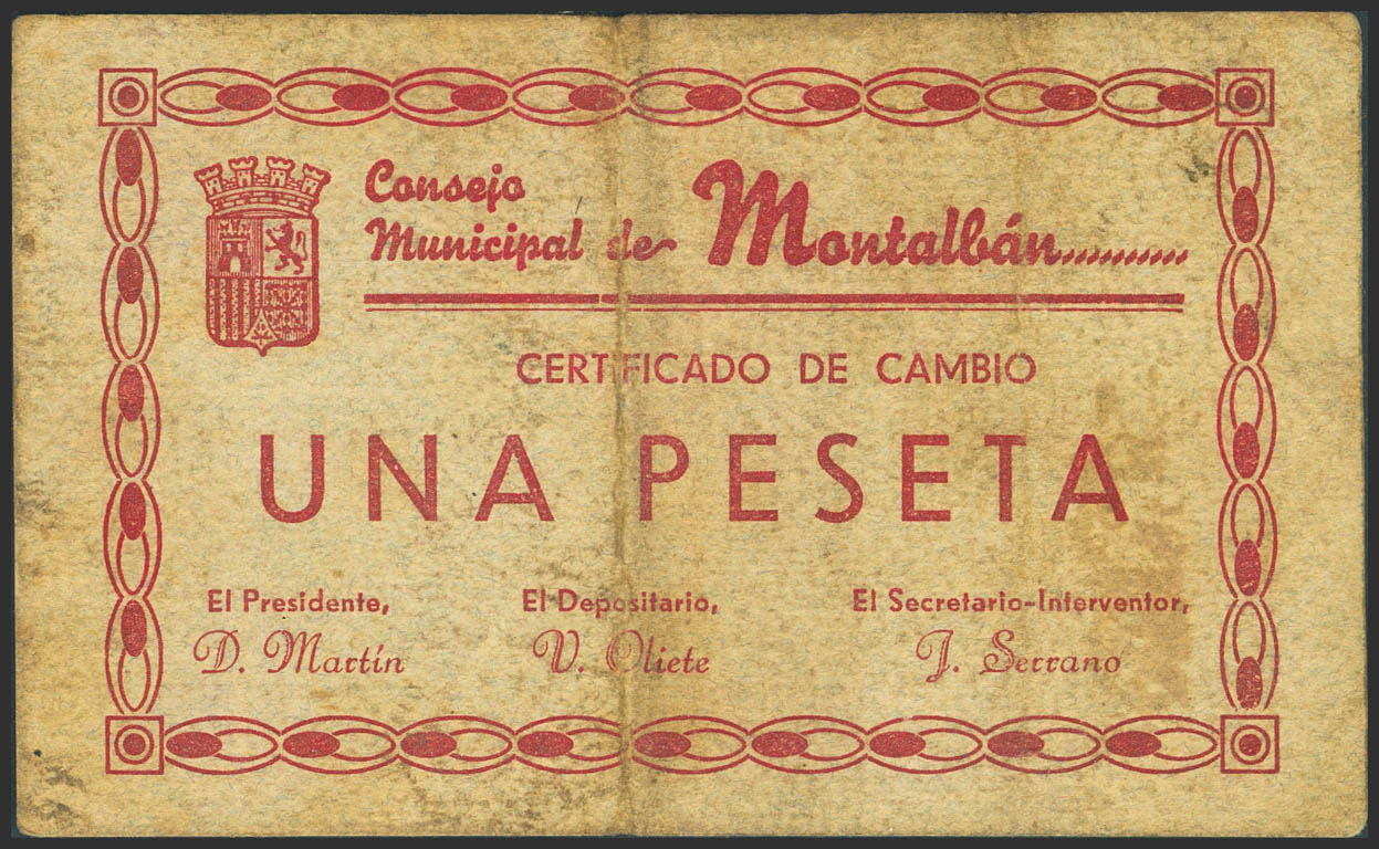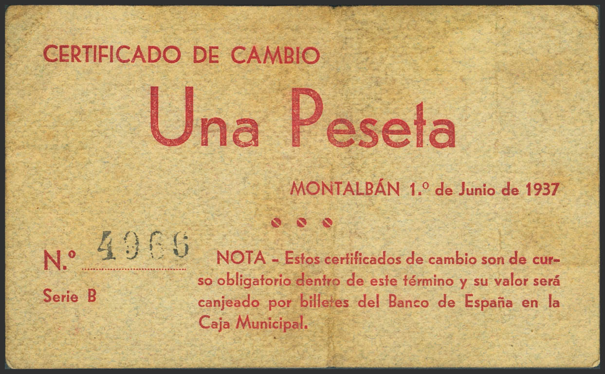 MONTALBAN (TERUEL). 1 Peseta. 1 de Junio de 1937. Serie B. (González: 3621). Raro. MBC-.