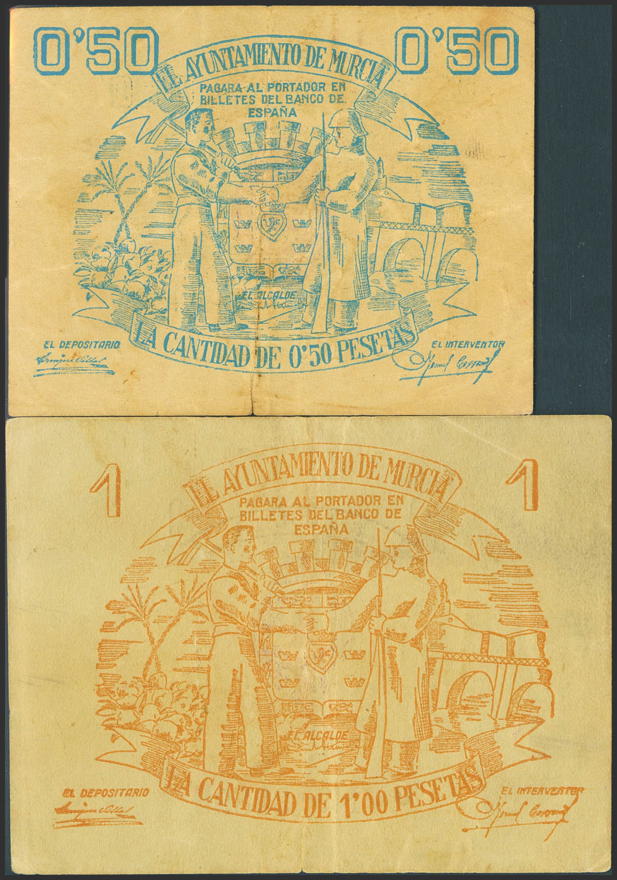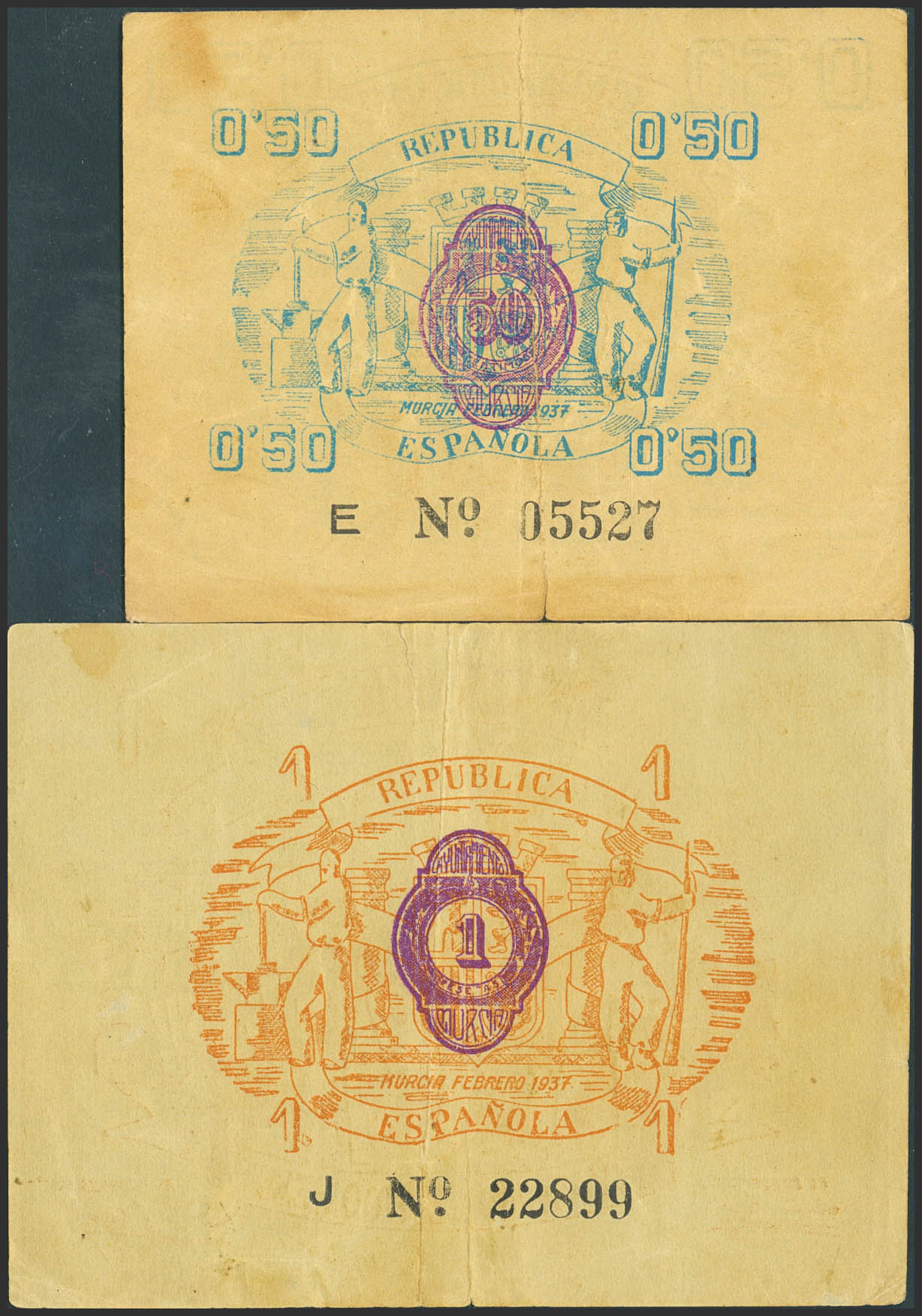 MURCIA. 50 Céntimos y 1 Peseta. (1937ca). Serie E y J, respectivamente. (González: 3768/69). Inusual serie completa. MBC-.