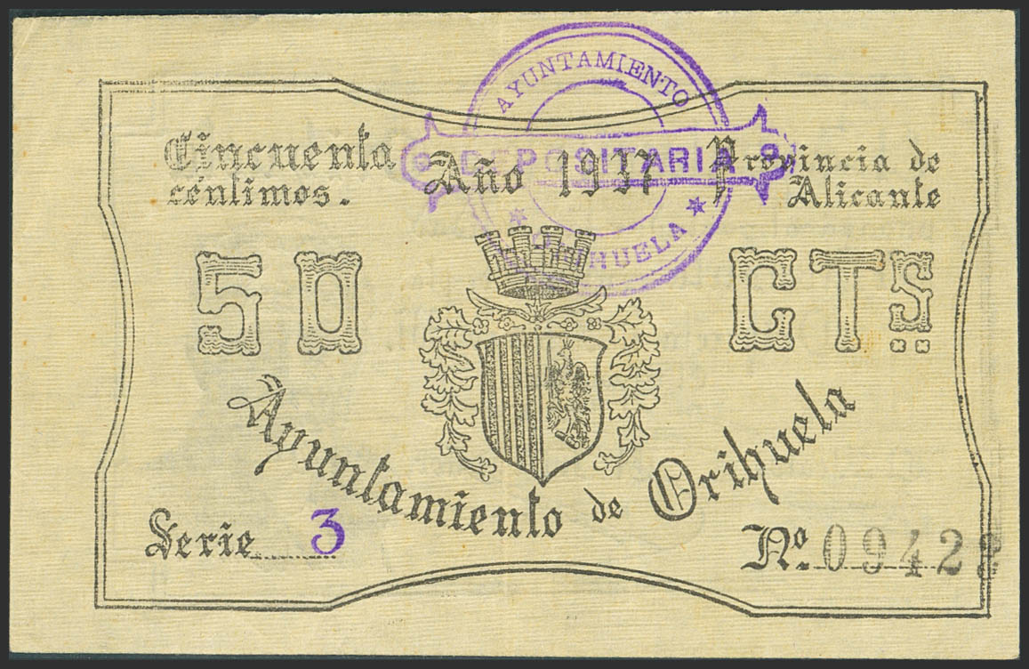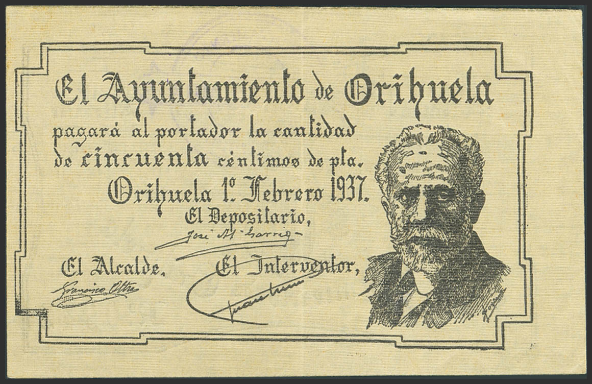 ORIHUELA (ALICANTE). 50 Céntimos. 1 de Febrero de 1937. Serie 3. (González: 3893). Inusual. EBC-.