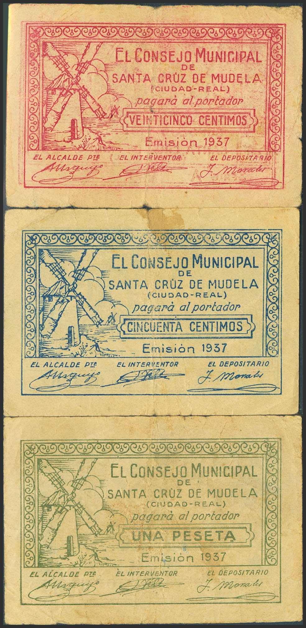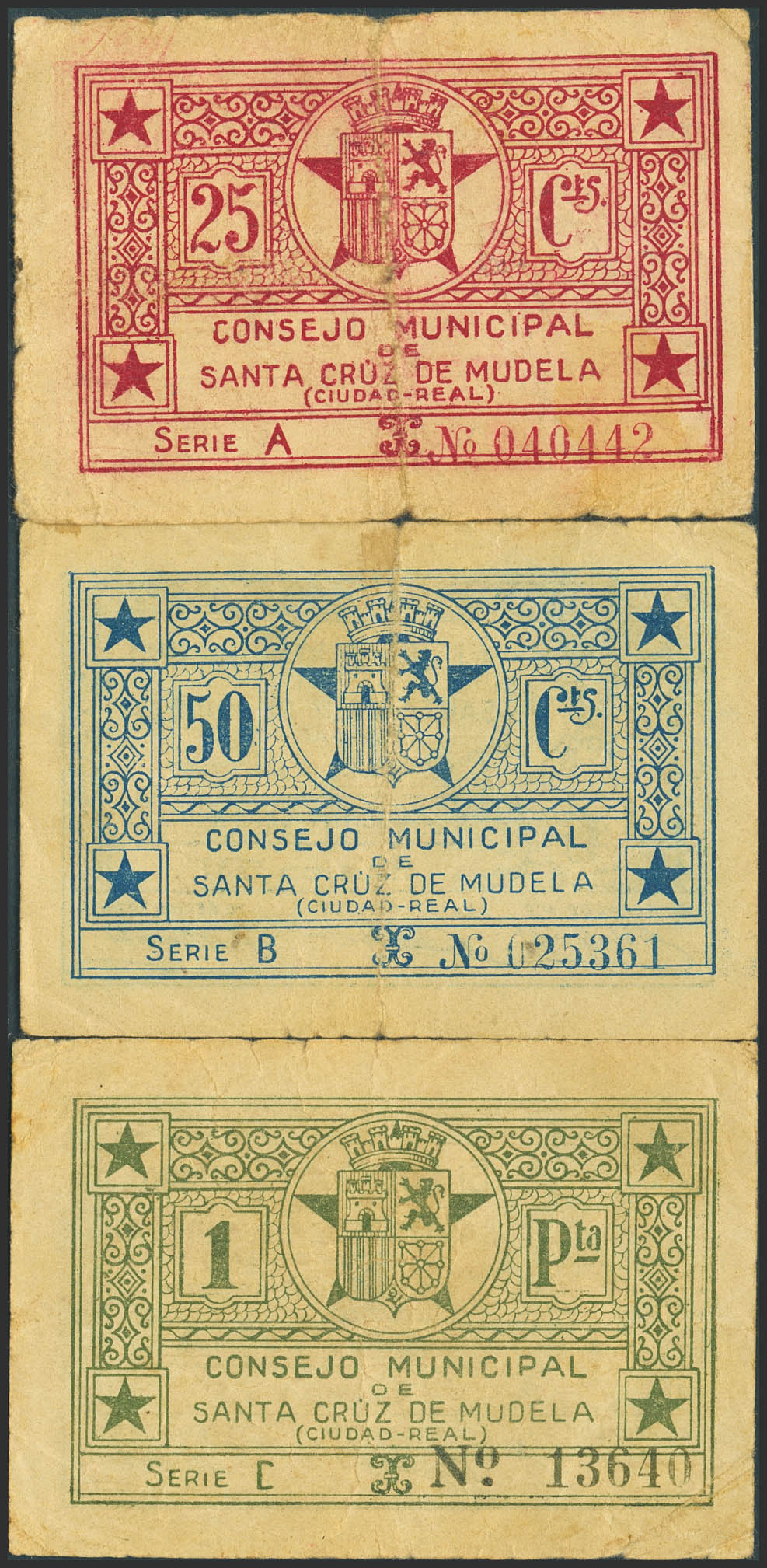 SANTA CRUZ DE MUDELA (CIUDAD REAL). 25 Céntimos, 50 Céntimos y 1 Peseta. 1937. (González: 4730/32). Inusual serie completa. BC.