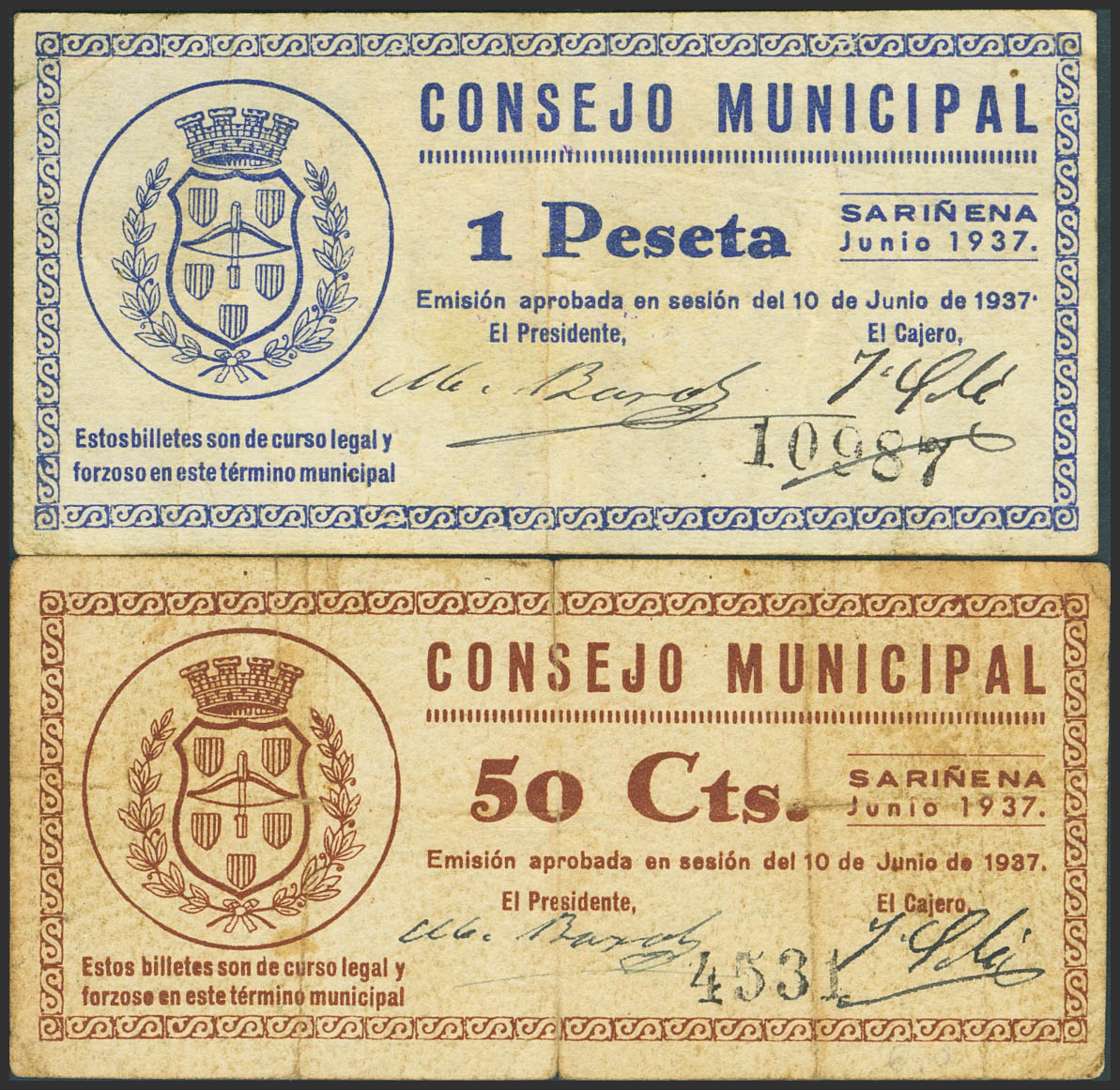 SARIÑENA (HUESCA). 50 Céntimos y 1 Peseta. Julio de 1937. (González: 4785/86). Serie completa. BC-.