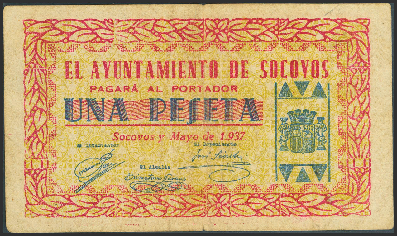 SOCOVOS (ALBACETE). 1 Peseta. Mayo de 1937. (González: 4881). Raro. MBC.