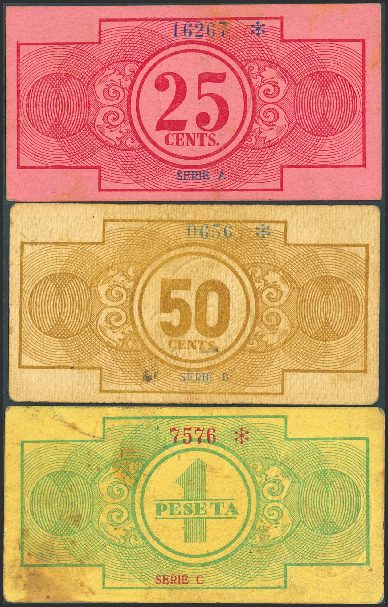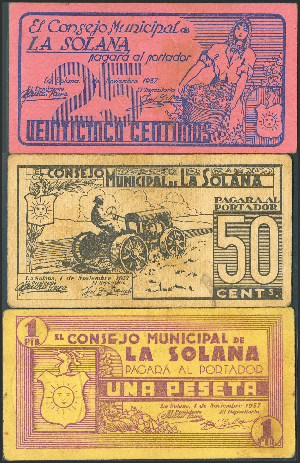 SOLANA (CIUDAD REAL). 25 Céntimos, 50 Céntimos y 1 Peseta. 1 de Noviembre de 1937. Serie A, B y C, respectivamente. (González: 4888/90). Inusual serie completa. SC/EBC-.
