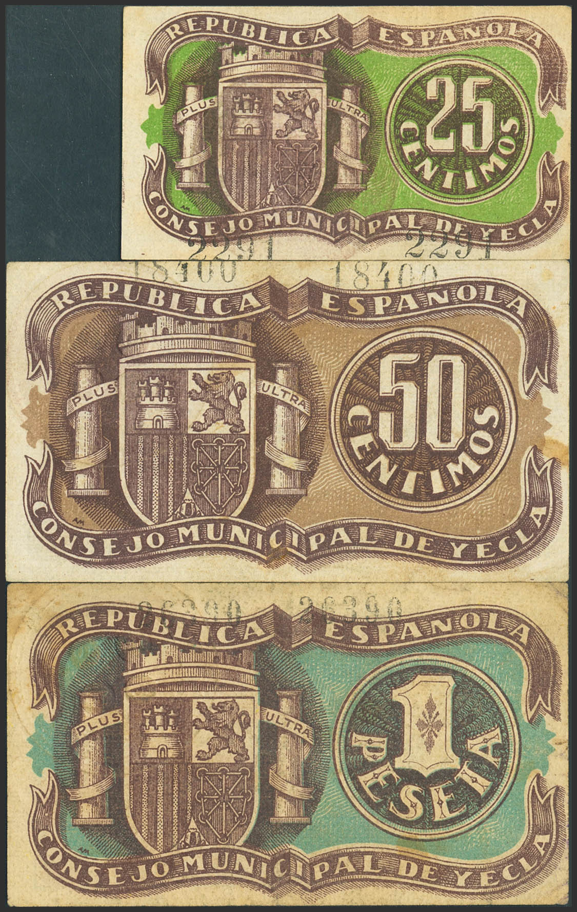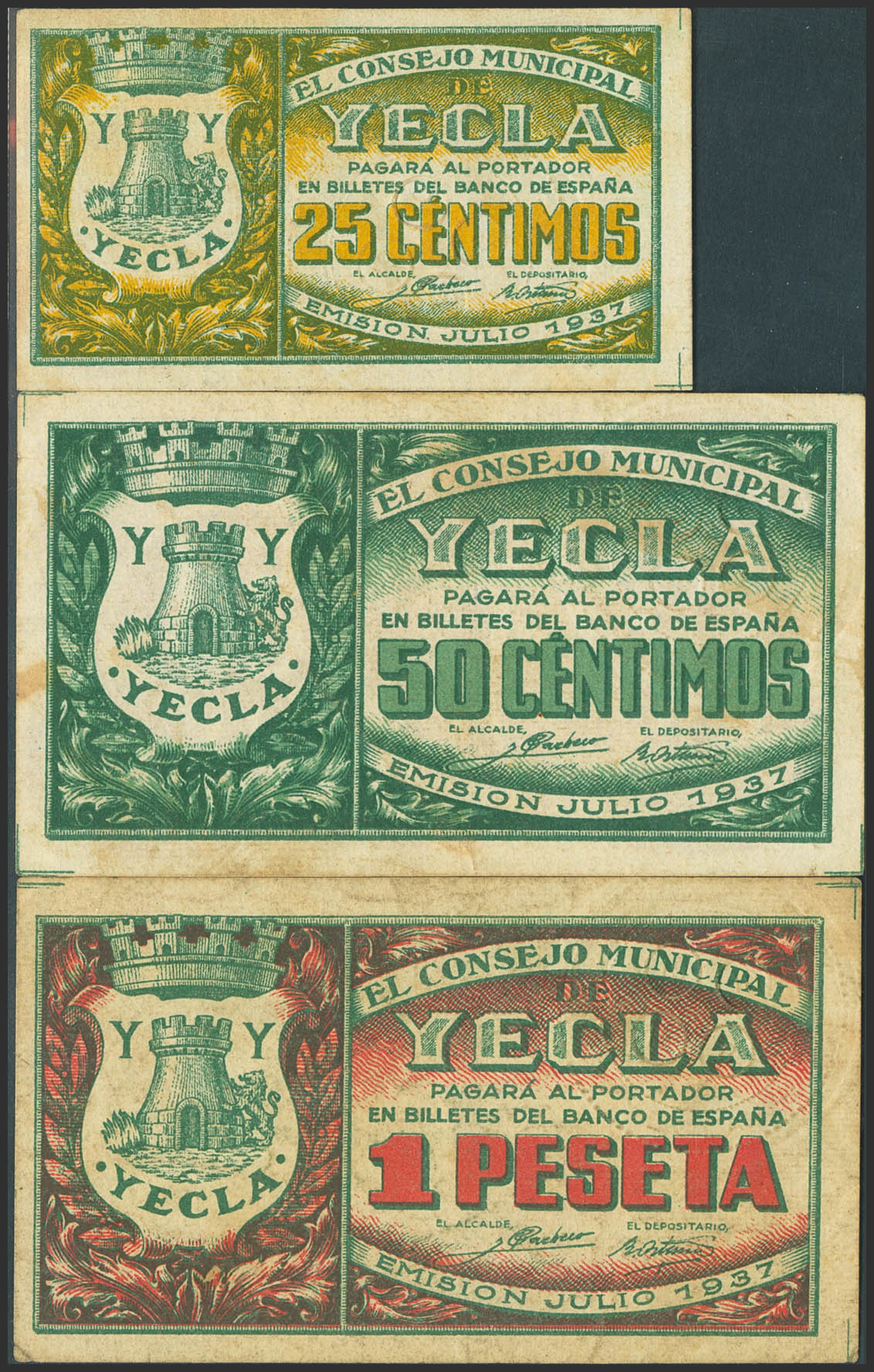 YECLA (MURCIA). 25 Céntimos, 50 Céntimos y 1 Peseta. Julio de 1937. (González: 5807/09). Serie completa. MBC+.
