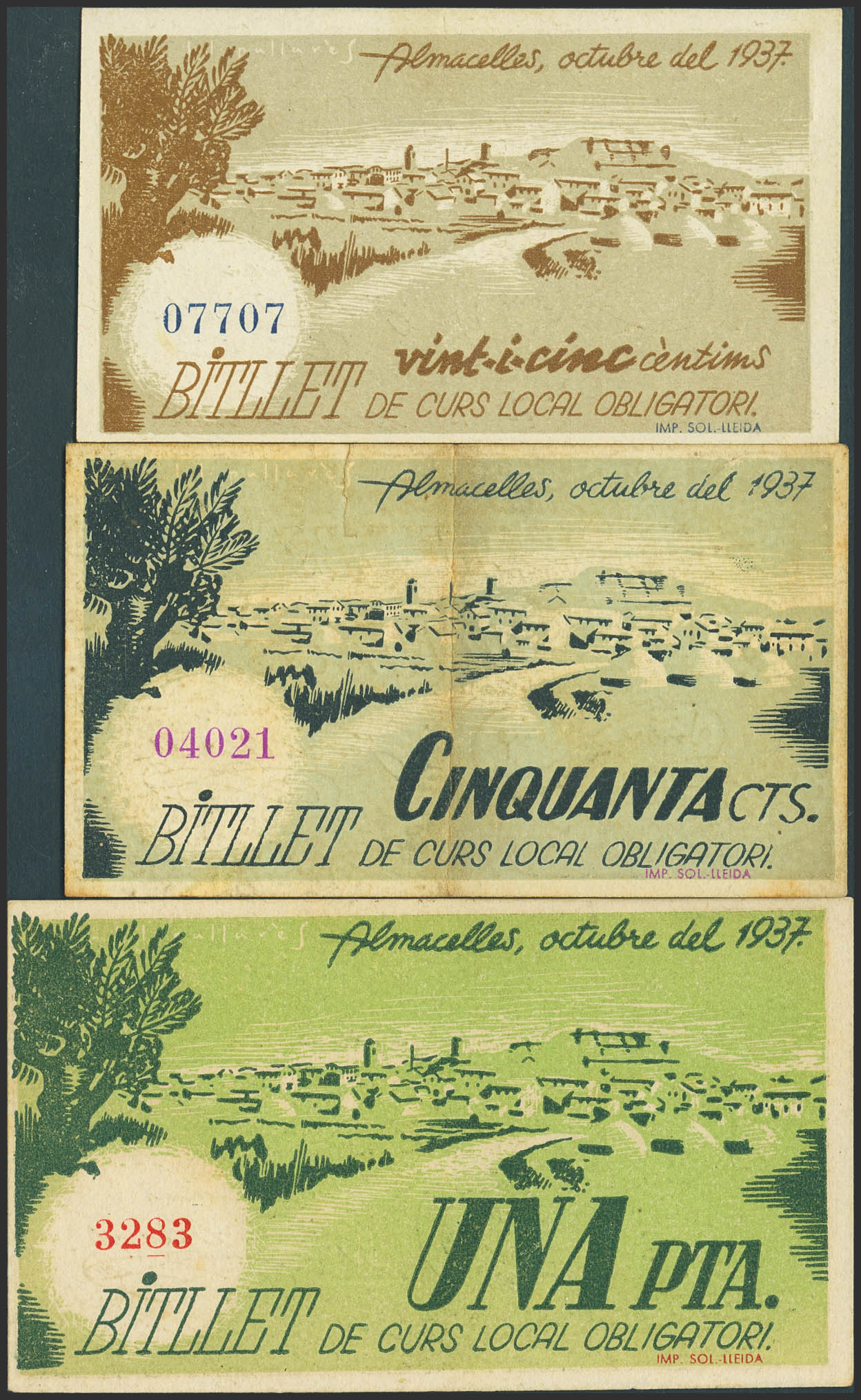 ALMACELLES (LERIDA). 25 Céntimos, 50 Céntimos y 1 Peseta. Octubre de 1937. (González: 6207/09). Inusual serie completa en esta calidad. EBC+/EBC.