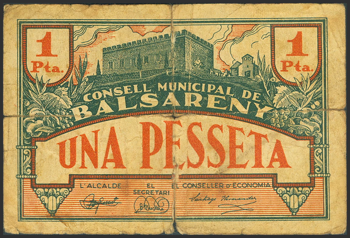 BALSARENY (BARCELONA). 1 Peseta. (1937ca). (González: 6496). Raro. BC.
