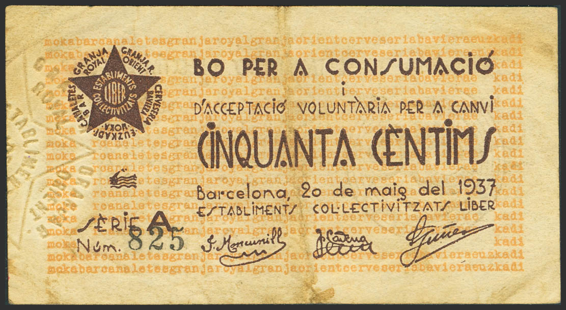 BARCELONA. 50 Céntimos. 20 de Mayo de 1937. Serie A. (González: 6714). Inusual. MBC-.