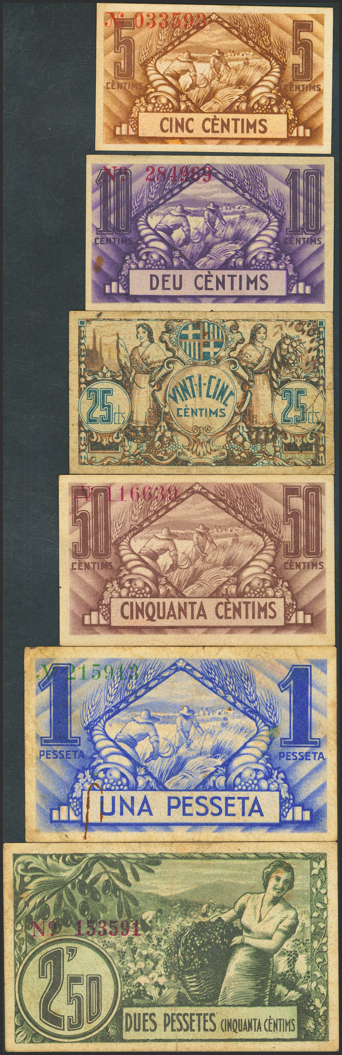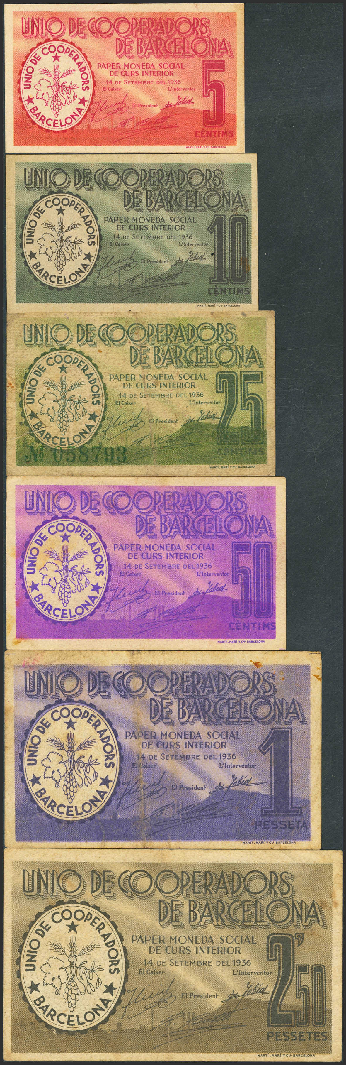 BARCELONA. 5 Céntimos, 10 Céntimos, 25 Céntimos, 50 Céntimos, 1 Peseta y 2´5 Pesetas. 14 de Septiembre de 1936. (González: 6877/82). Rara serie completa. SC--/MBC.