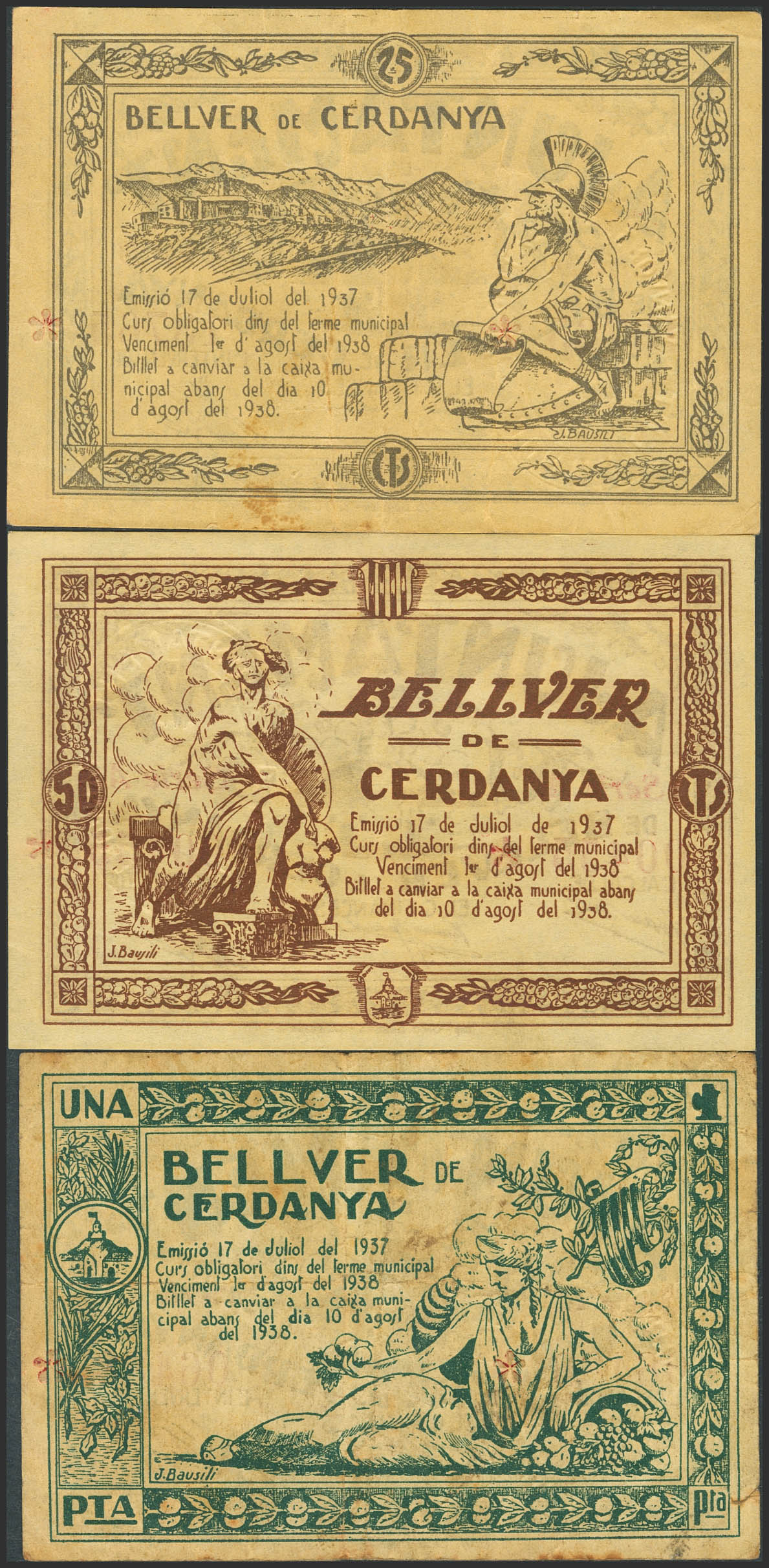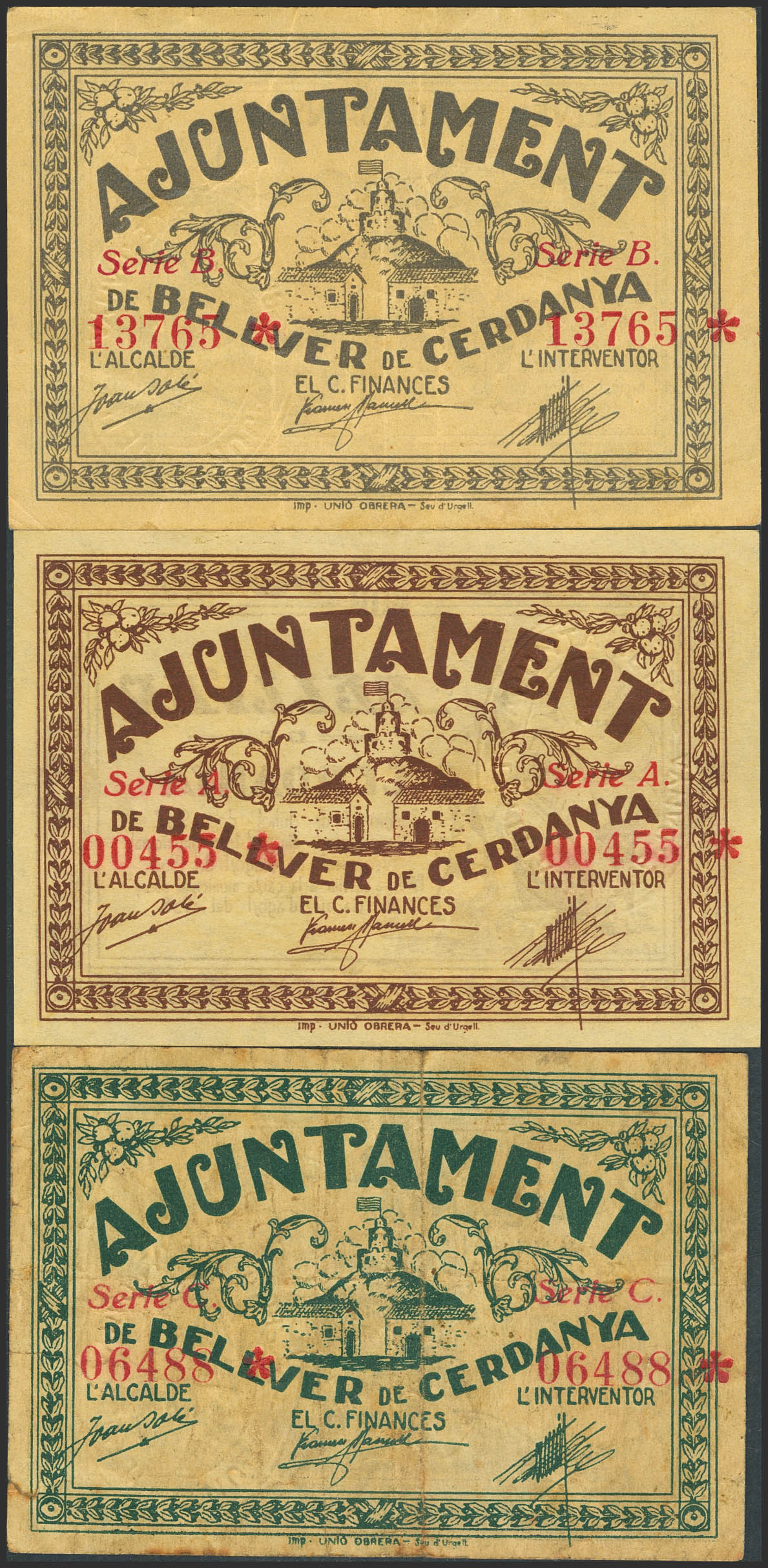 BELLVER DE CERDANYA (LERIDA). 25 Céntimos, 50 Céntimos y 1 Peseta. 17 de Julio de 1937, Serie B, A y C, respectivamente. (González: 7006/08). Serie completa. EBC+++/MBC-.