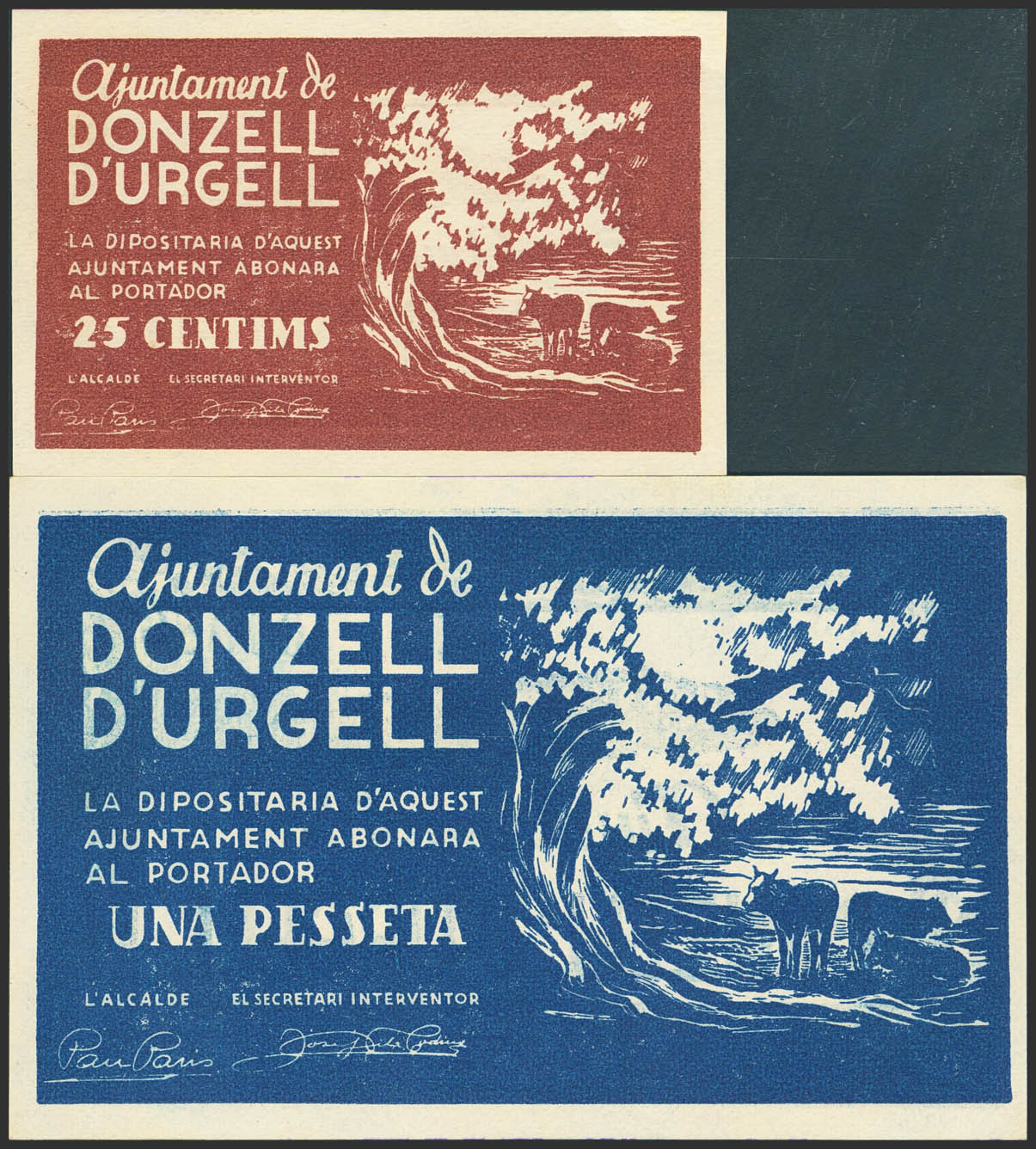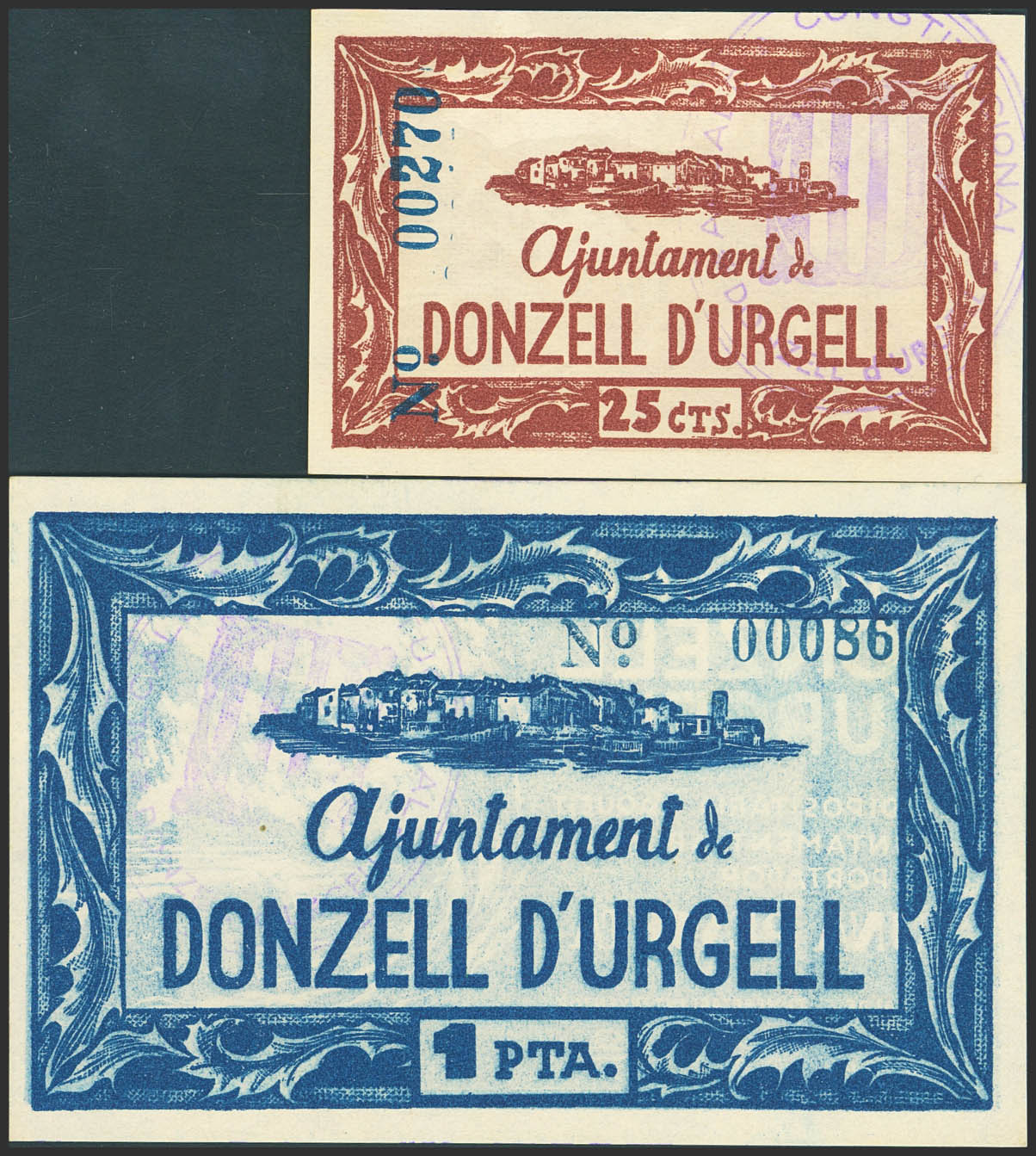 DONZELL DE URGEL (LERIDA). 25 Céntimos y 1 Peseta. (1937ca). (González: 7719/20). Muy rara serie completa, especialmente en esta calidad. SC.