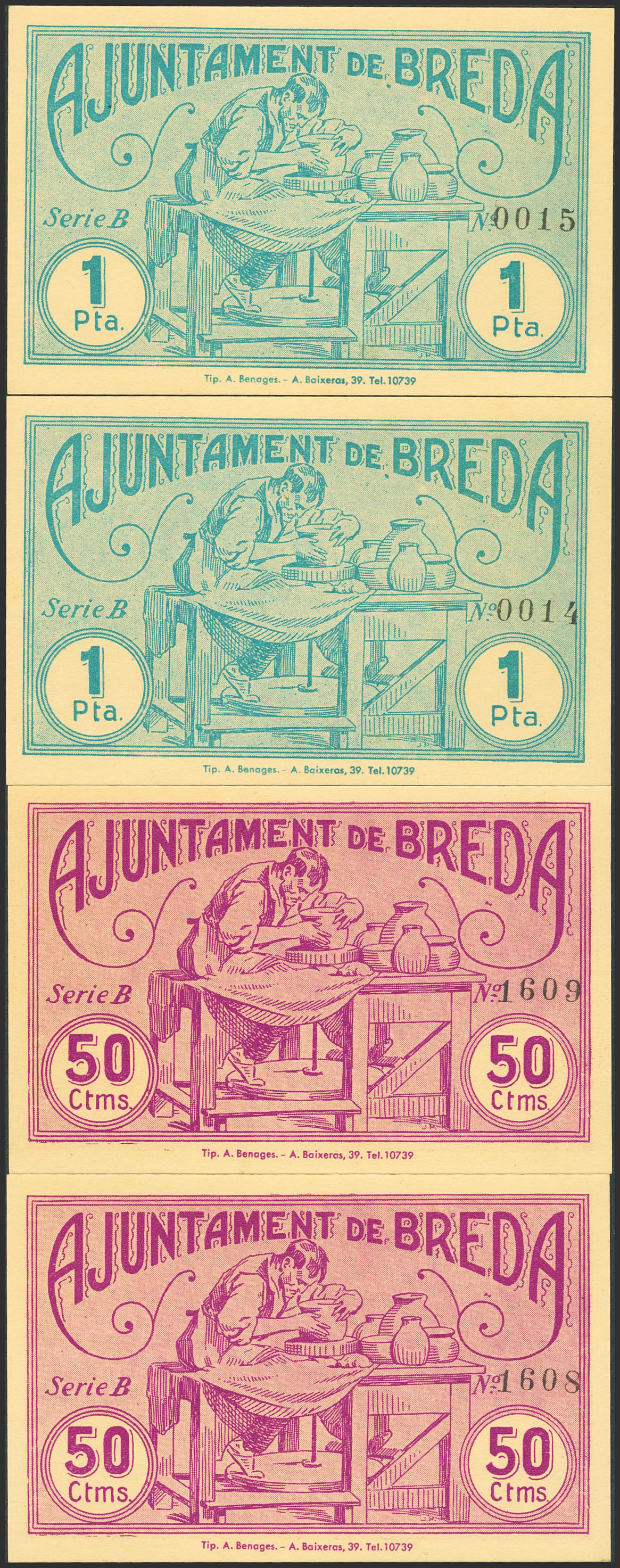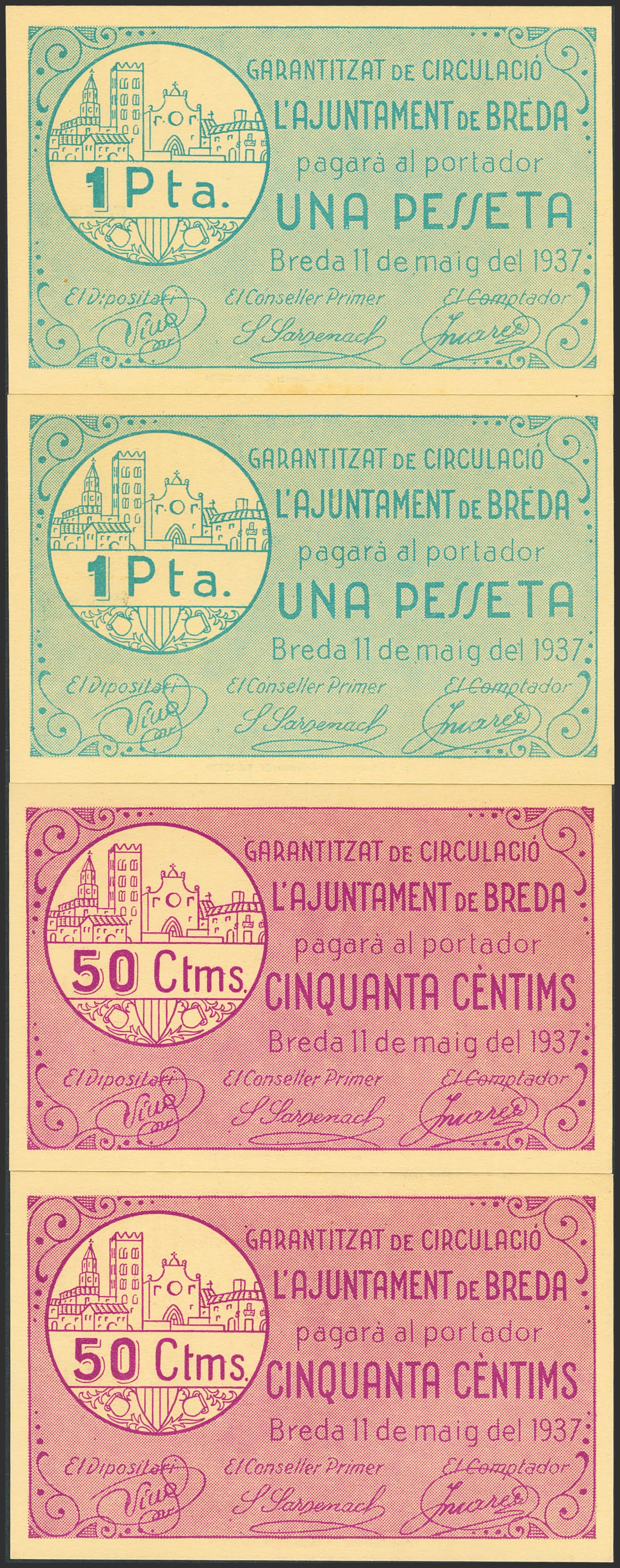 BREDA (GERONA). 50 Céntimos (pareja correlativa) y 1 Peseta (pareja correlativa). 11 de Mayo de 1937. Serie B, todos. (González: 7202/03). Inusual serie completa. SC.