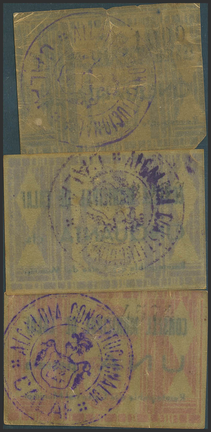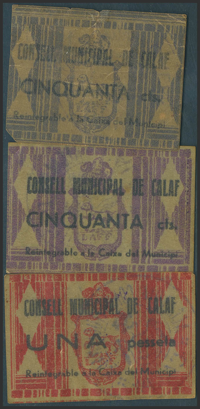 CALAF (BARCELONA). 50 Céntimos (2) y 1 Peseta. (1937ca). (González: 7256, 7258, 7259). Raros. MBC+.