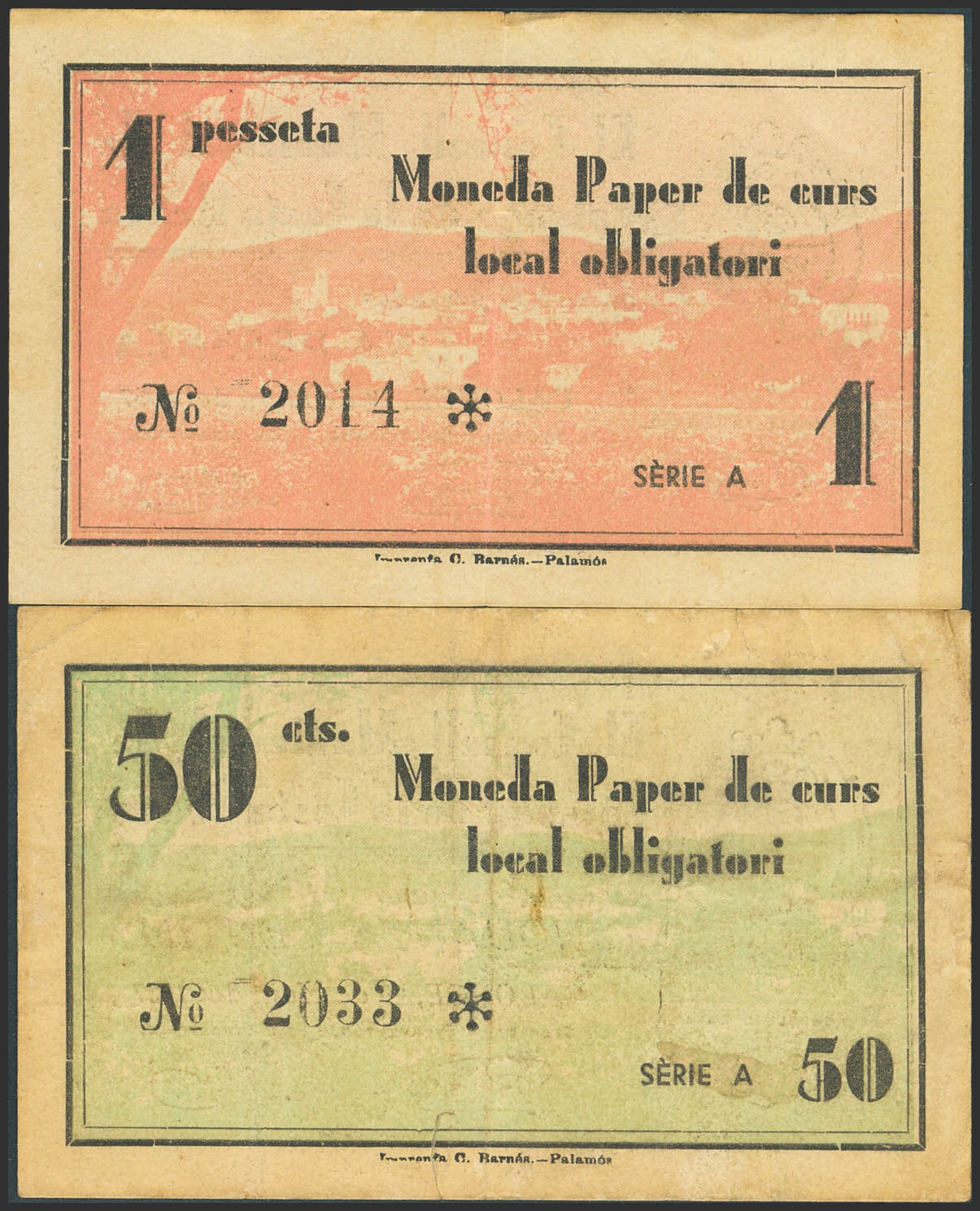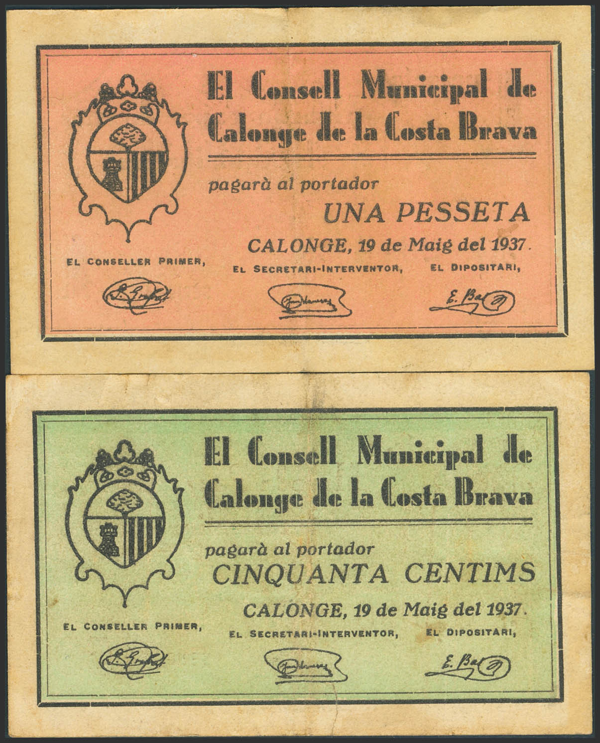 CALONGE DE LA COSTA BRAVA (GERONA). 25 Céntimos y 50 Céntimos. 19 de Mayo de 1937. Serie A. (González: 7305/06). Inusual serie completa. MBC-.