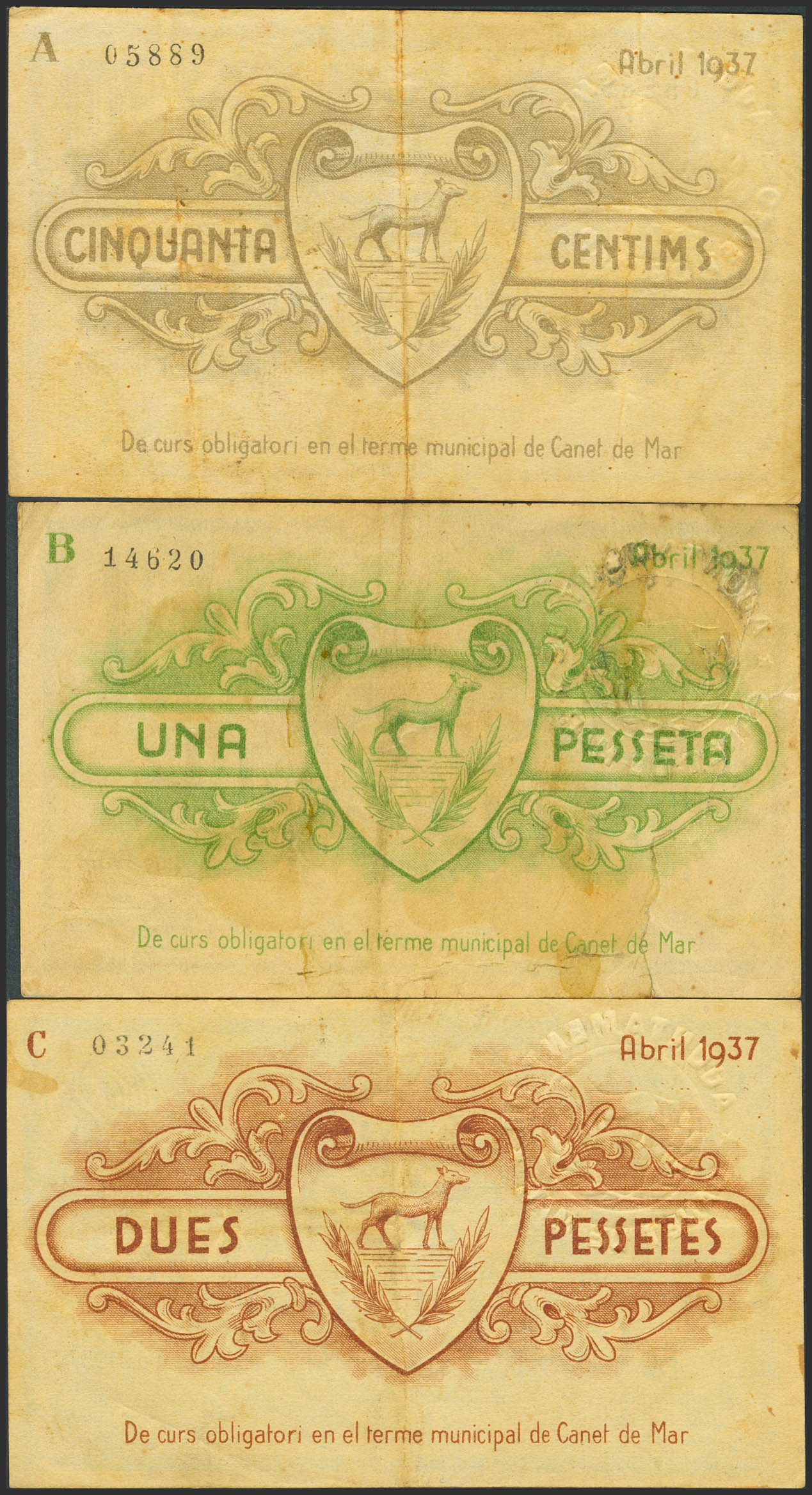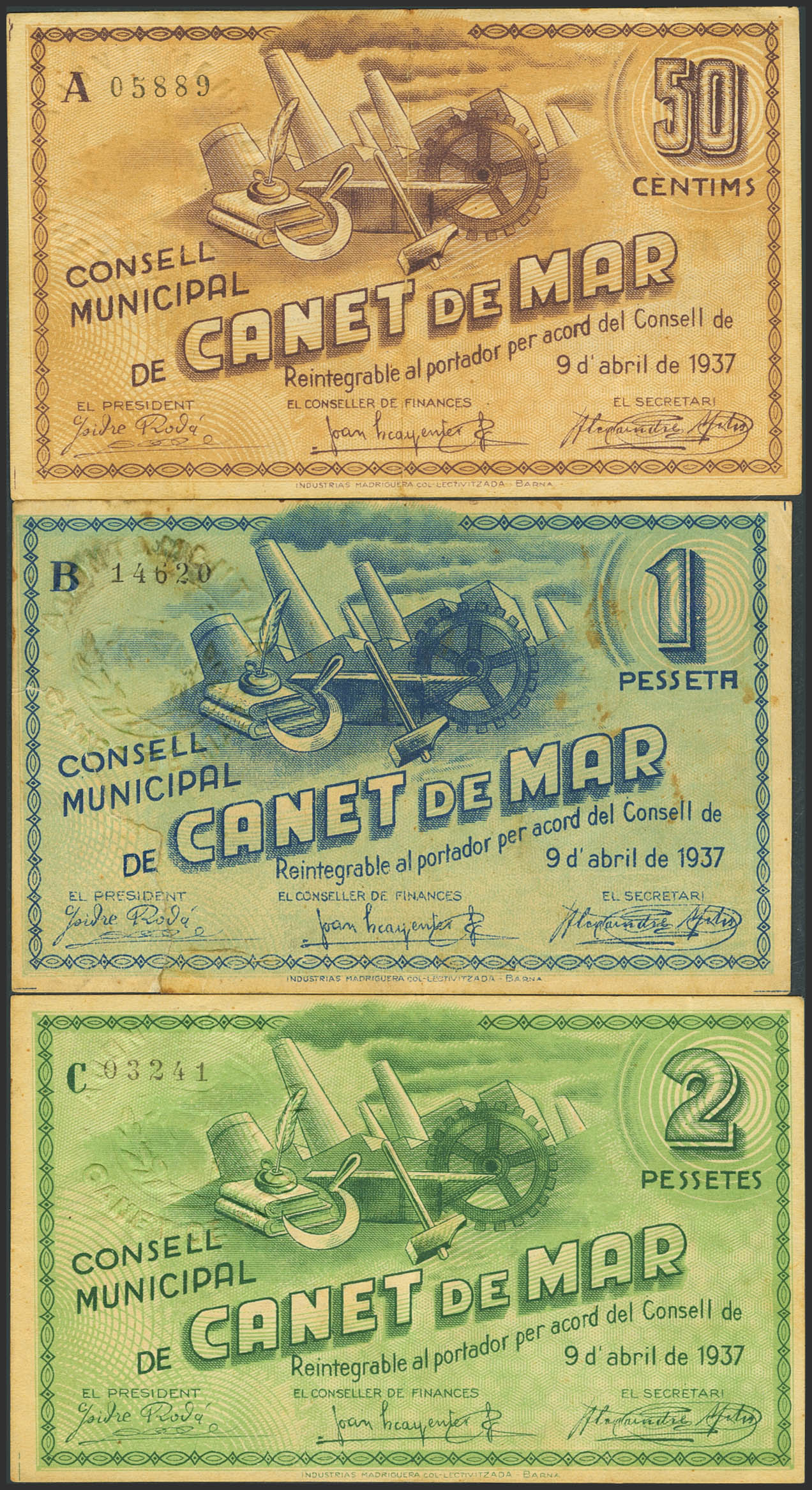 CANET DE MAR (BARCELONA). 50 Céntimos, 1 Peseta y 2 Pesetas. Abril de 1937. Serie A, B y C, respectivamente. (González: 7342/44). Serie completa. EBC-/MBC.