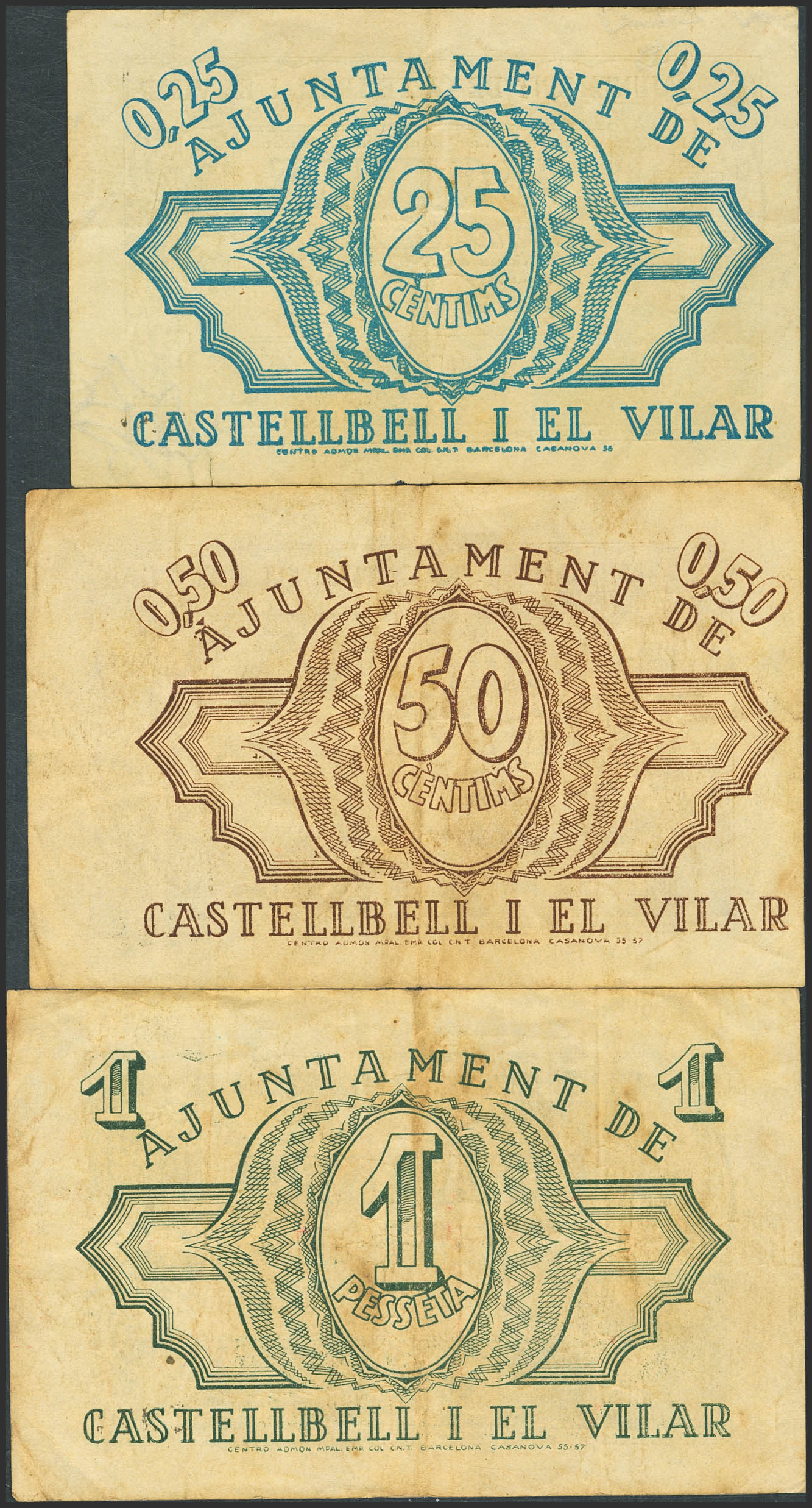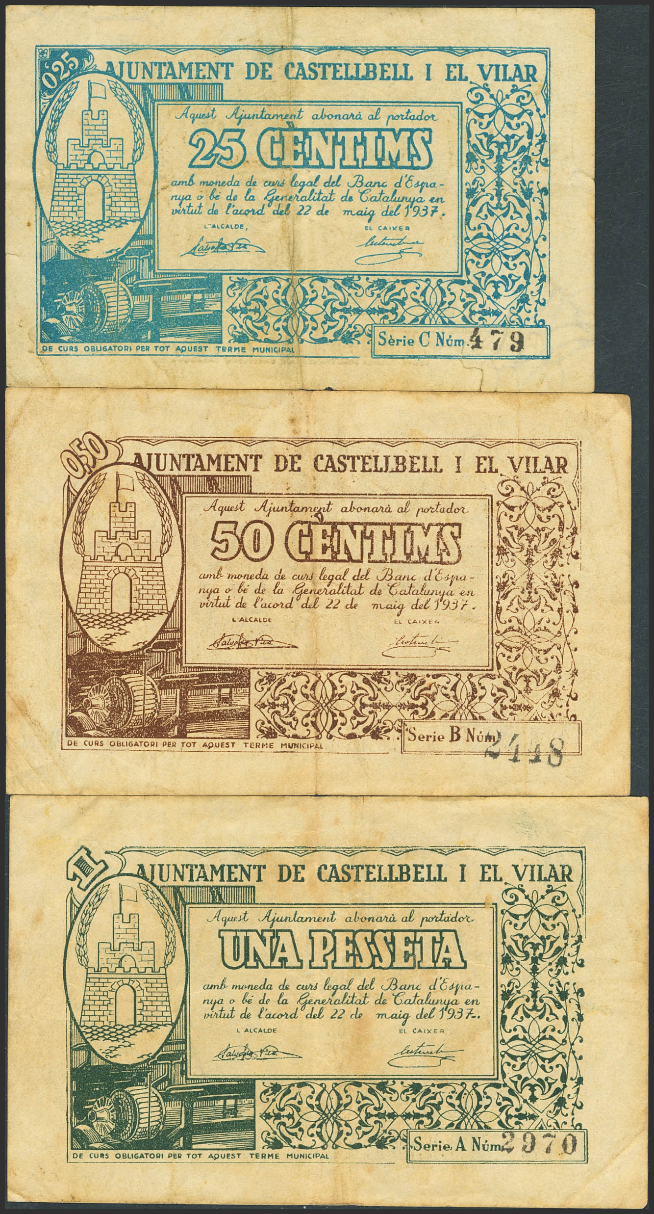 CASTELLBELL EL VILAR (BARCELONA). 25 Céntimos, 50 Céntimos y 1 Peseta. 22 de Mayo de 1937. Serie C, B y A, respectivamente. (González: 7425/27). Inusual serie completa. MBC-.