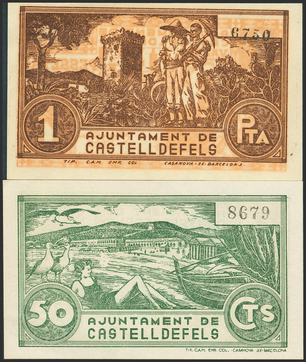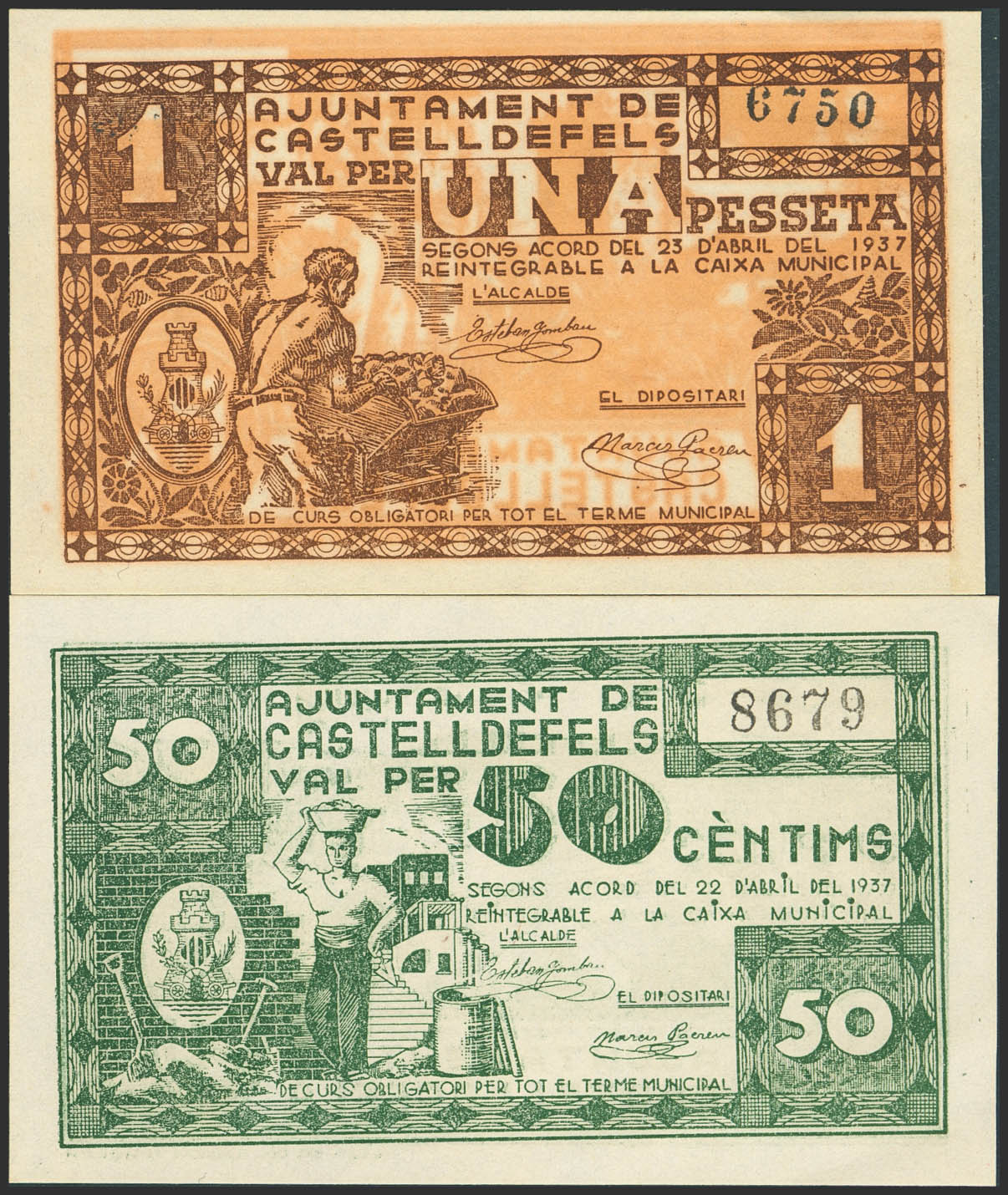 CASTELLDEFELS (BARCELONA). 50 Céntimos y 1 Peseta. 22 de Abril de 1937. (González: 7447/48). Serie completa. SC-.