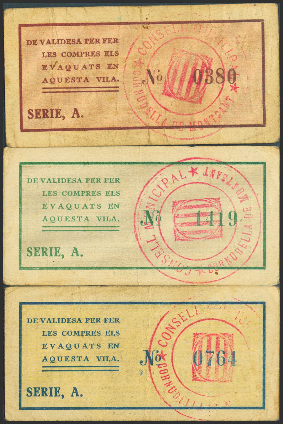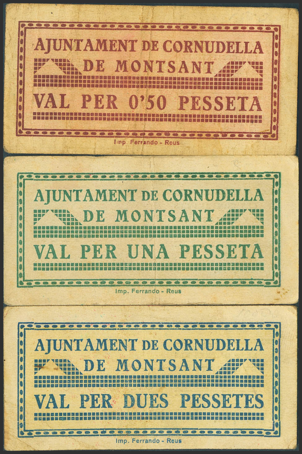 CORNUDELLA DE MONTSANT (TARRAGONA). 50 Céntimos, 1 Peseta y 2 Pesetas. (1937ca). Serie A, todos. (González: 7692/94). Muy rara serie completa. MBC.