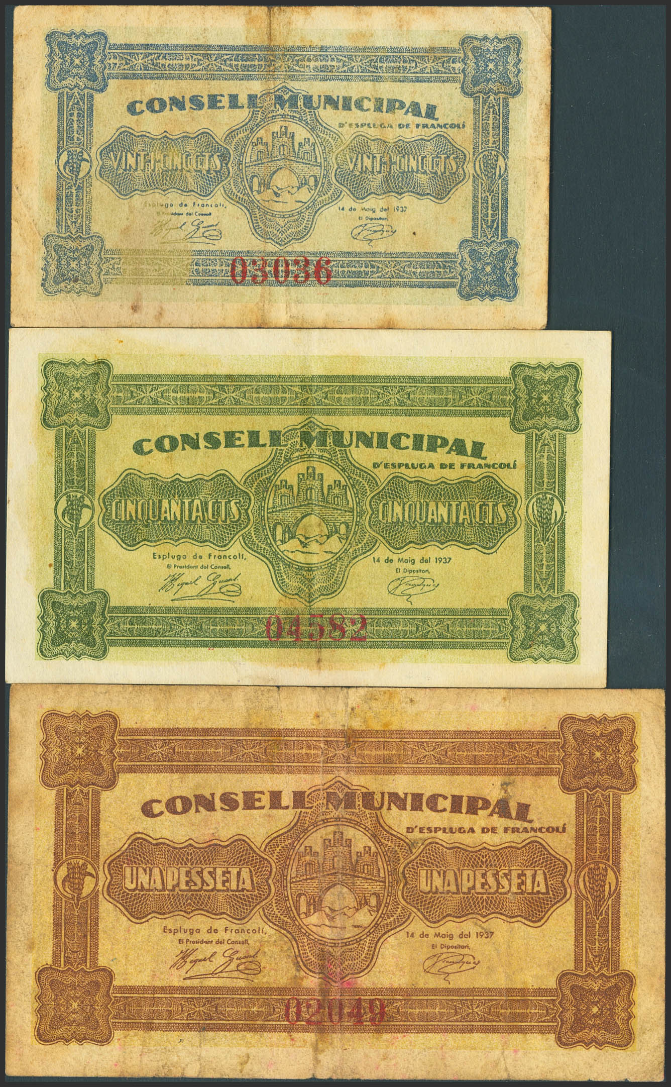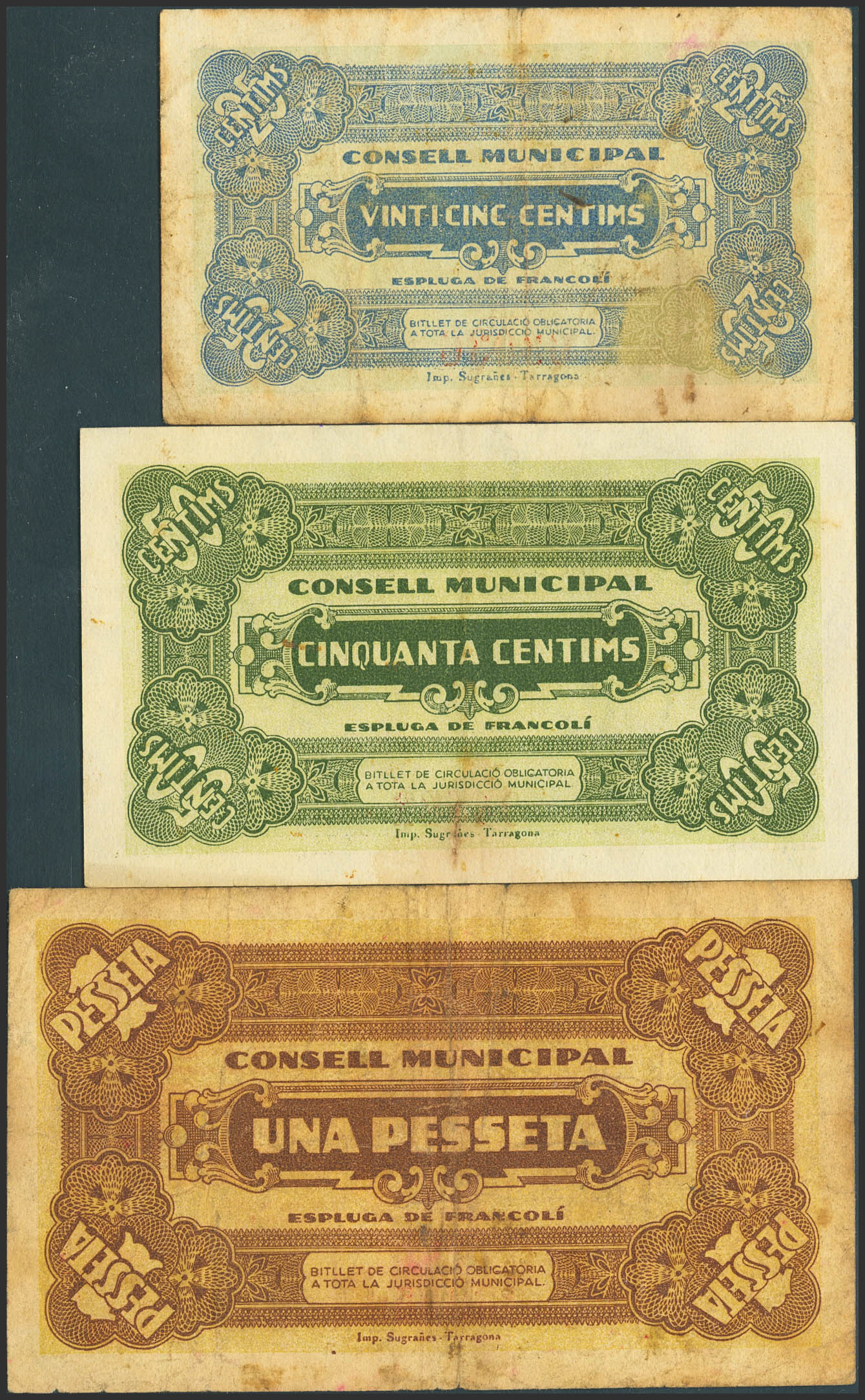 ESPLUGA DE FRANCOLI (TARRAGONA). 25 Céntimos, 50 Céntimos y 1 Peseta. 14 de Mayo de 1937. (González: 7771/73). Serie completa. MBC.