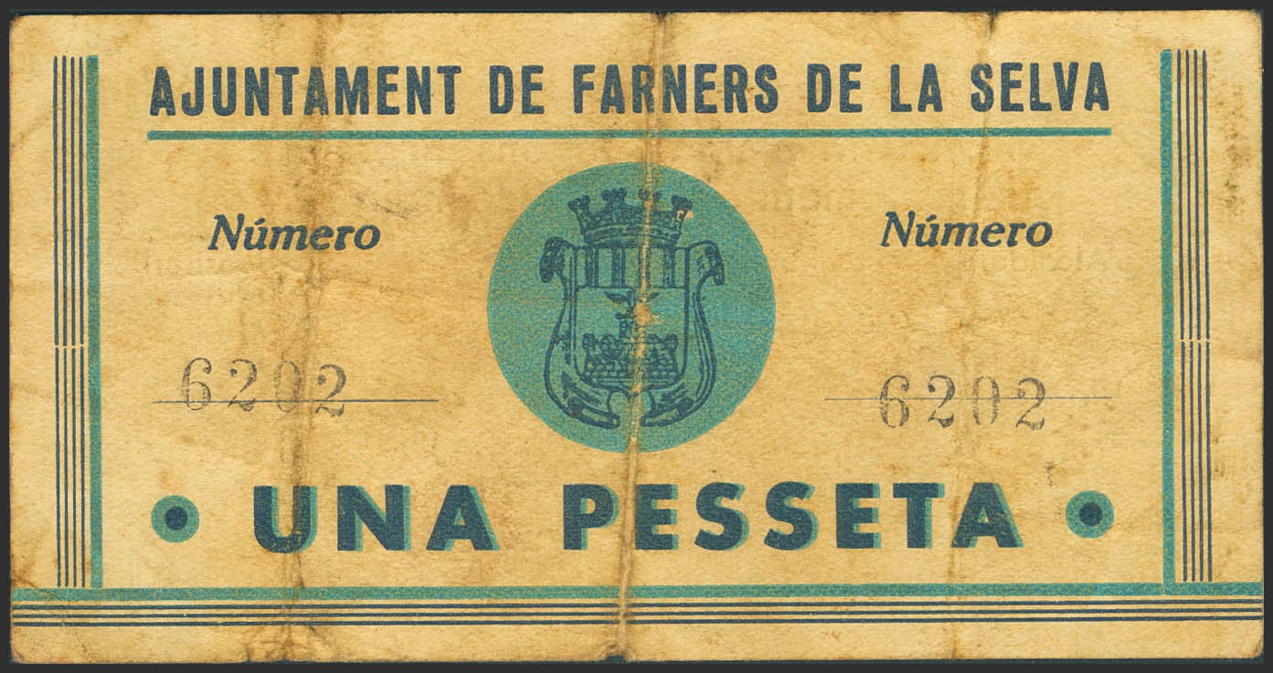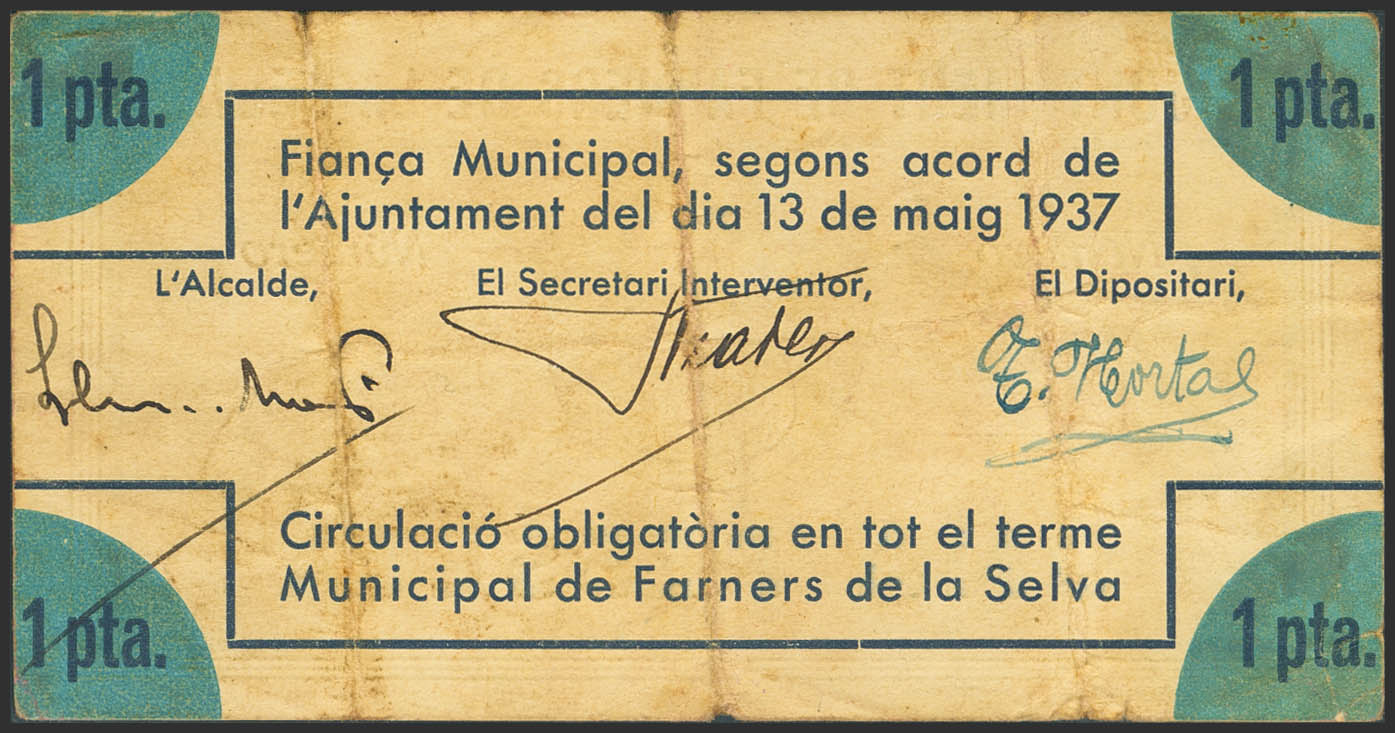 FARNERS DE LA SELVA (GERONA). 1 Peseta. 13 de Mayo de 1937. (González: 7828). Inusual. MBC-.
