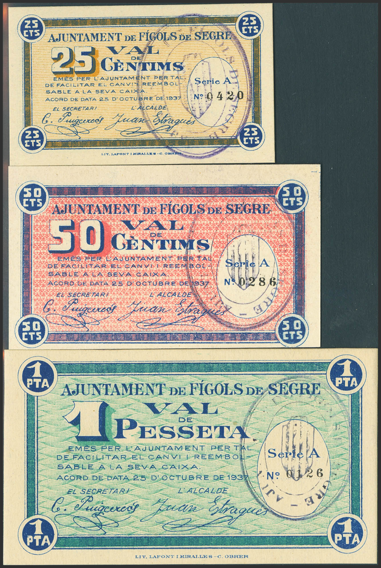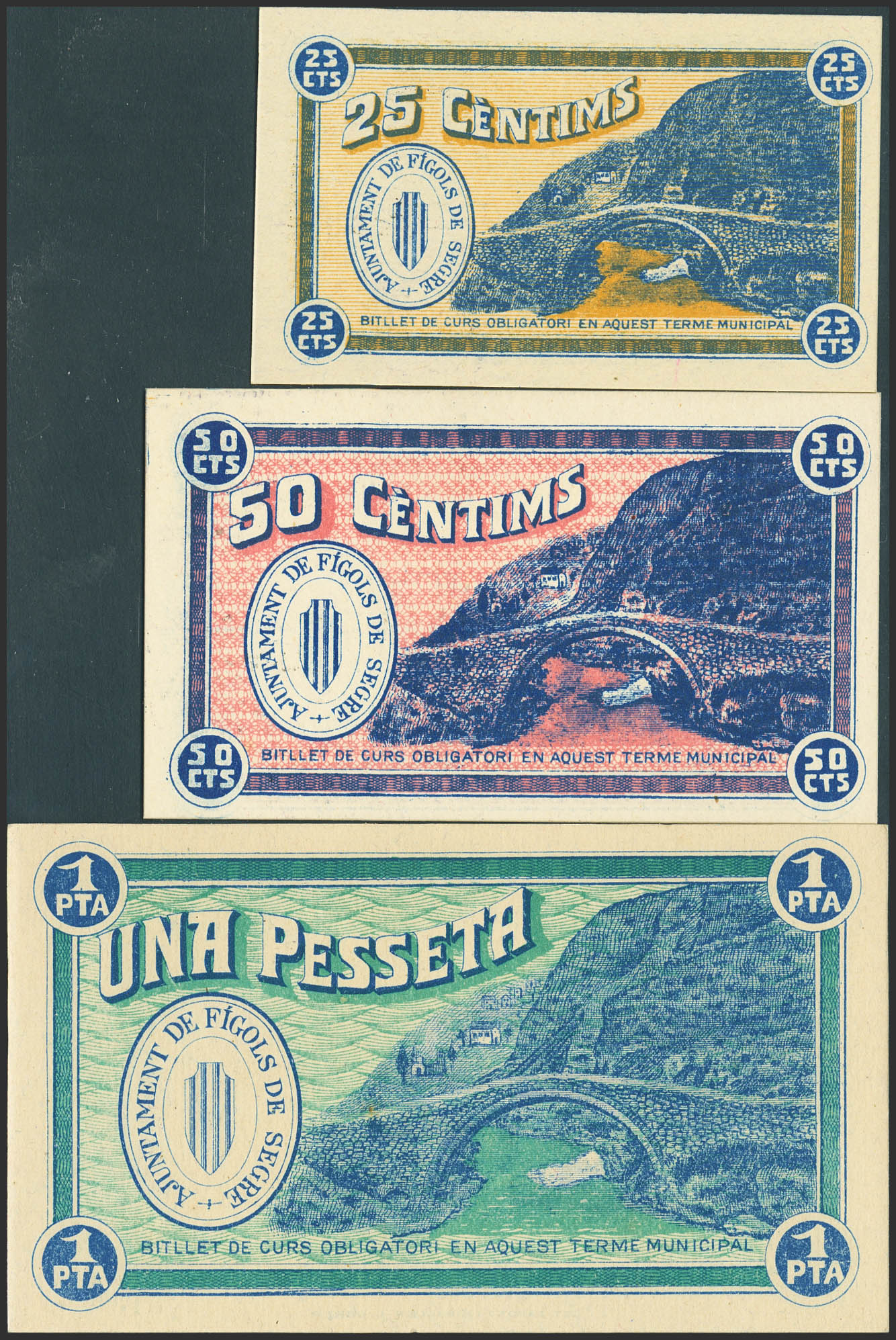 FIGOLS DE SEGRE (LERIDA). 25 Céntimos, 50 Céntimos y 1 Peseta. 25 de Octubre de 1937. Serie A, todos. (González: 7847/49). Muy rara serie completa, especialmente en esta calidad. SC.