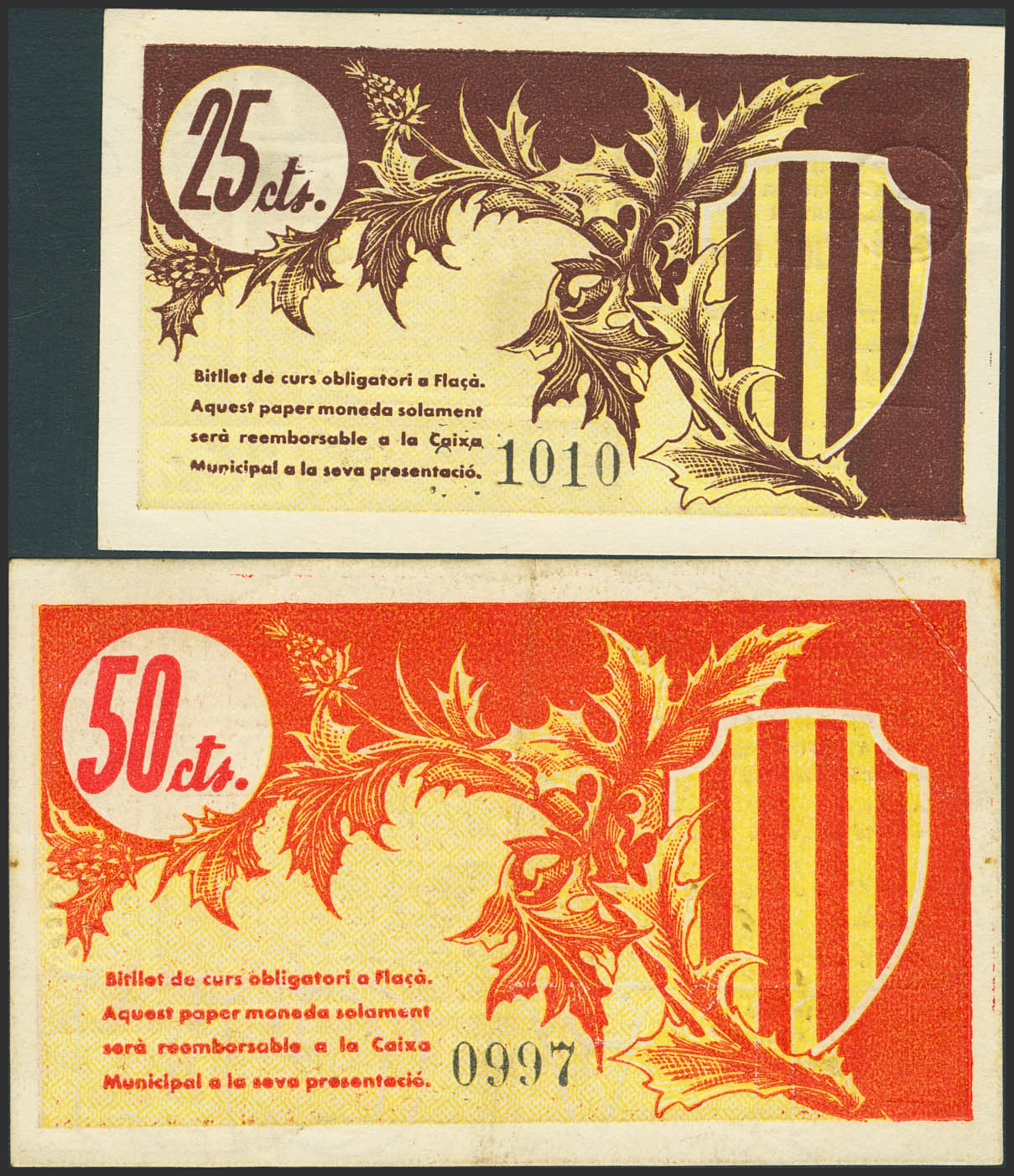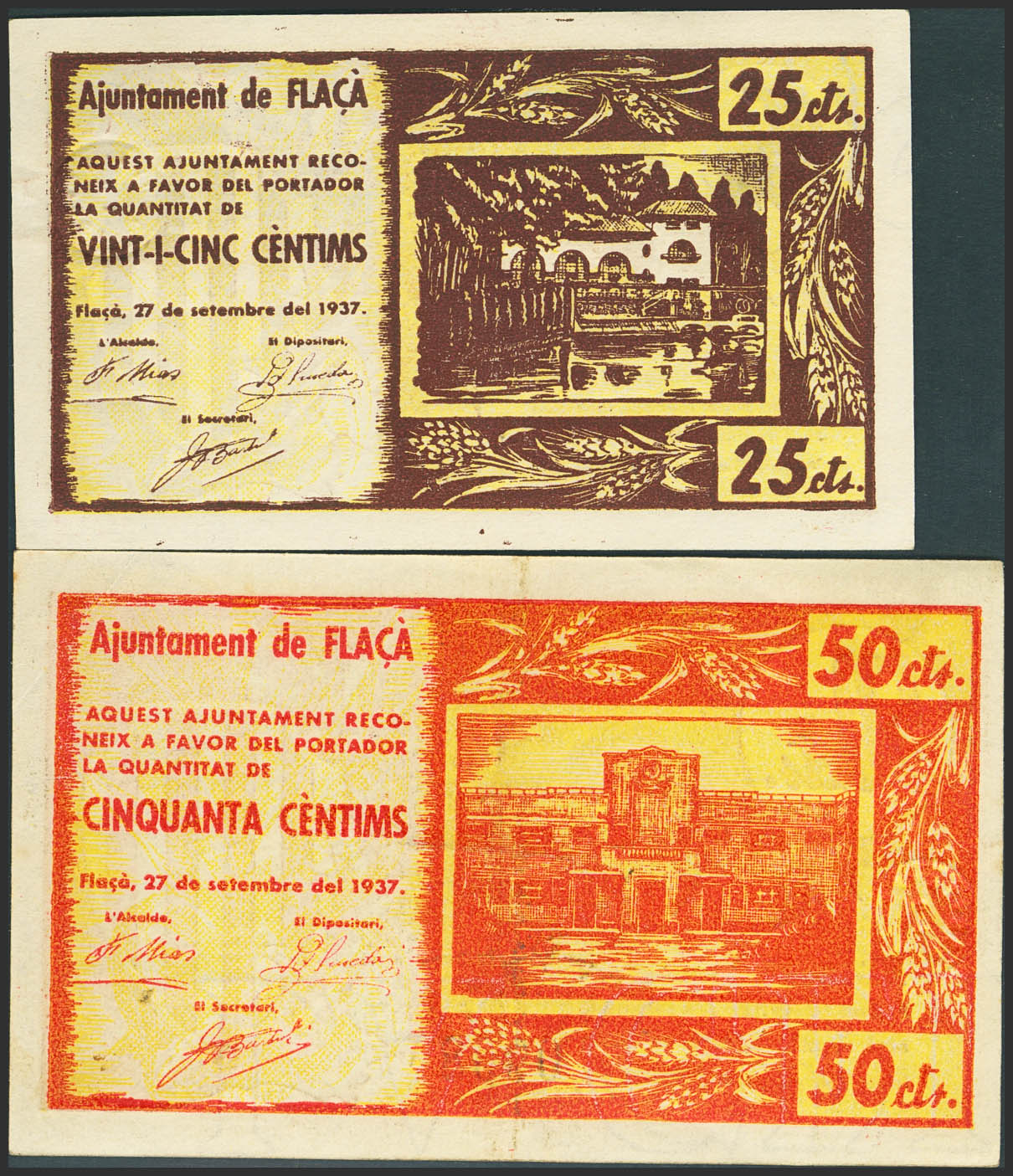 FLACA (GERONA). 25 Céntimos y 50 Céntimos. 27 de Septiembre de 1937. (González: 7881/82). Serie completa. SC-/MBC.