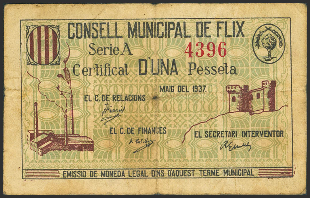 FLIX (TARRAGONA). 1 Peseta. Mayo de 1937. (González: 7883). Raro. MBC.