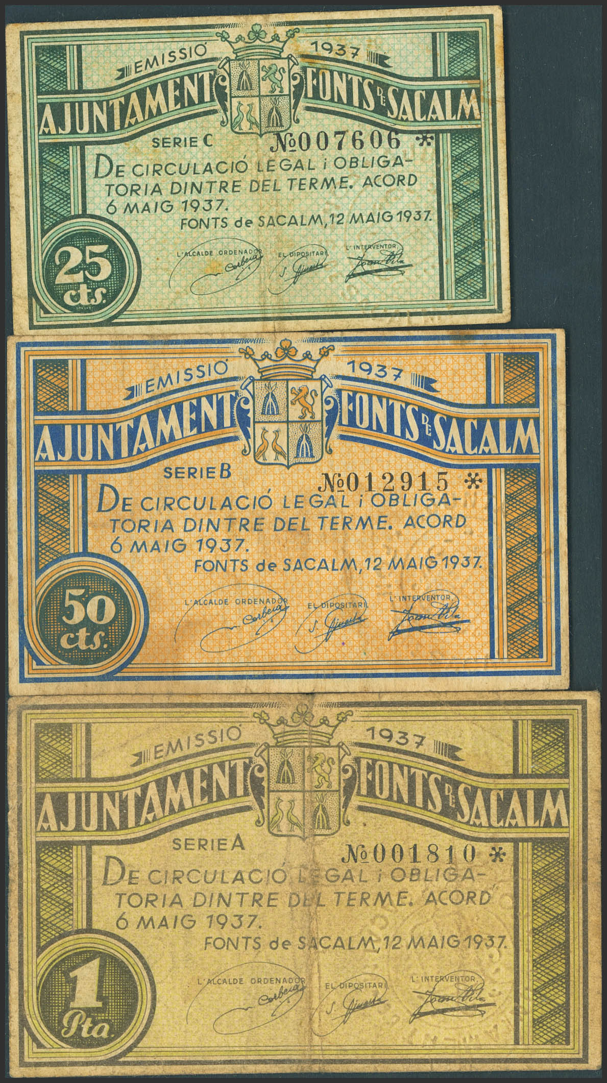 FONTS DE SACALM (GERONA). 25 Céntimos, 50 Céntimos y 1 Peseta. 12 de Mayo de 1937. (González: 7912/14). Serie completa. MBC-.