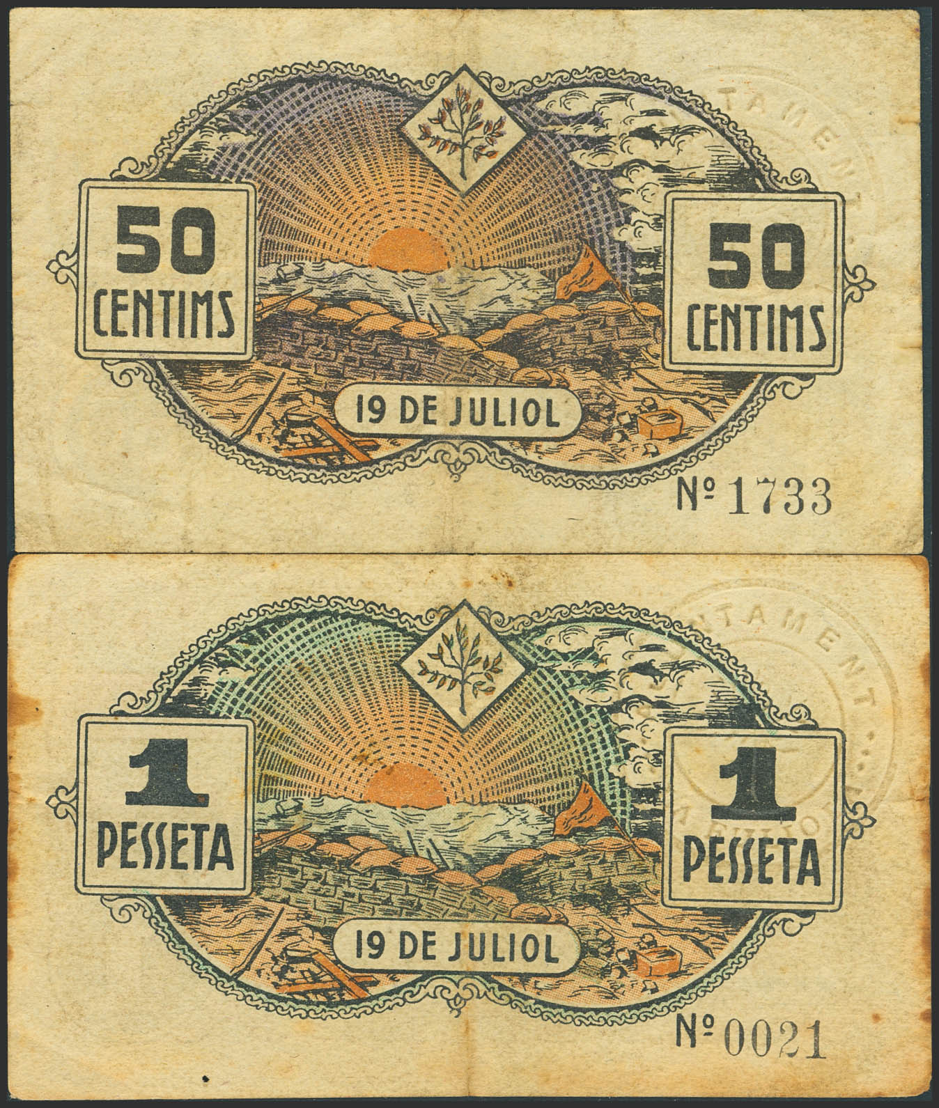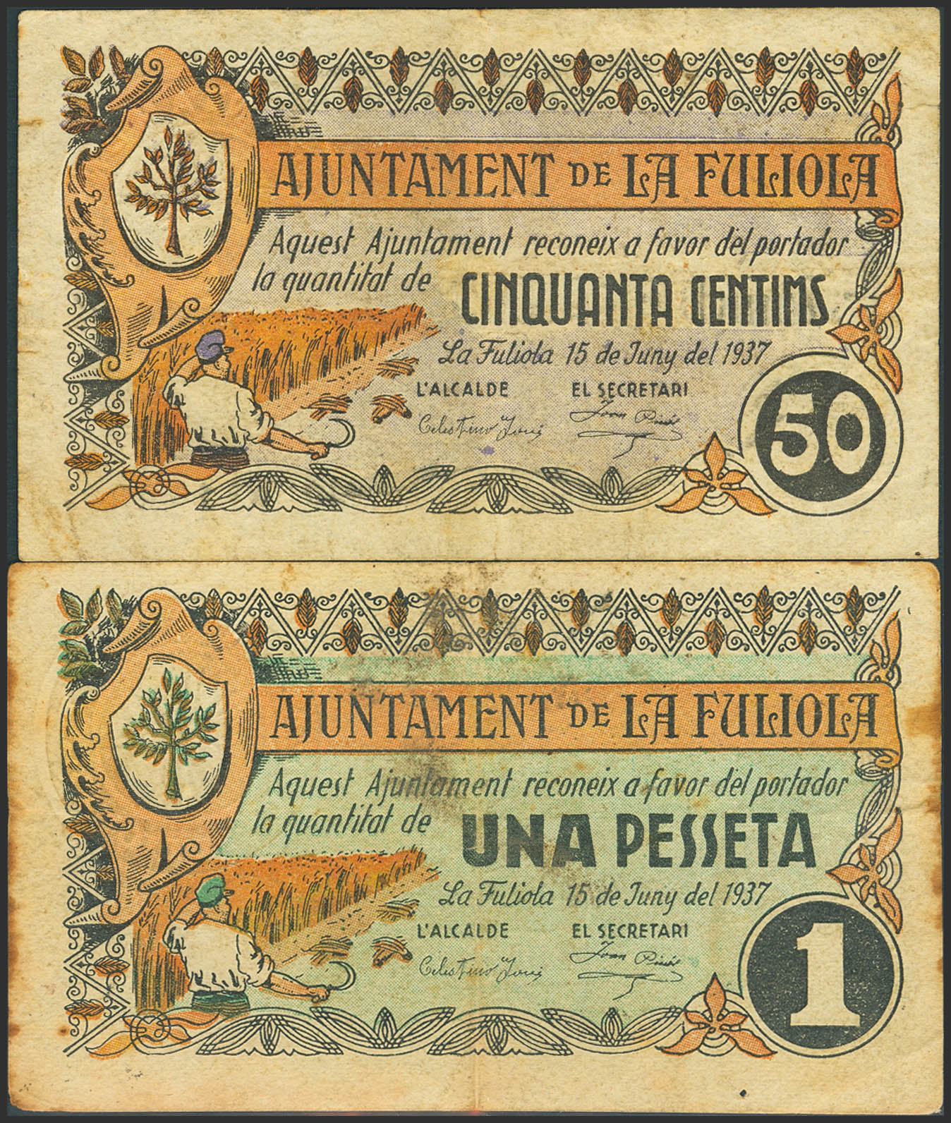 FULIOLA (LERIDA). 50 Céntimos y 1 Peseta. 15 de Junio de 1937. (González: 7942/43). Rara serie completa. MBC.
