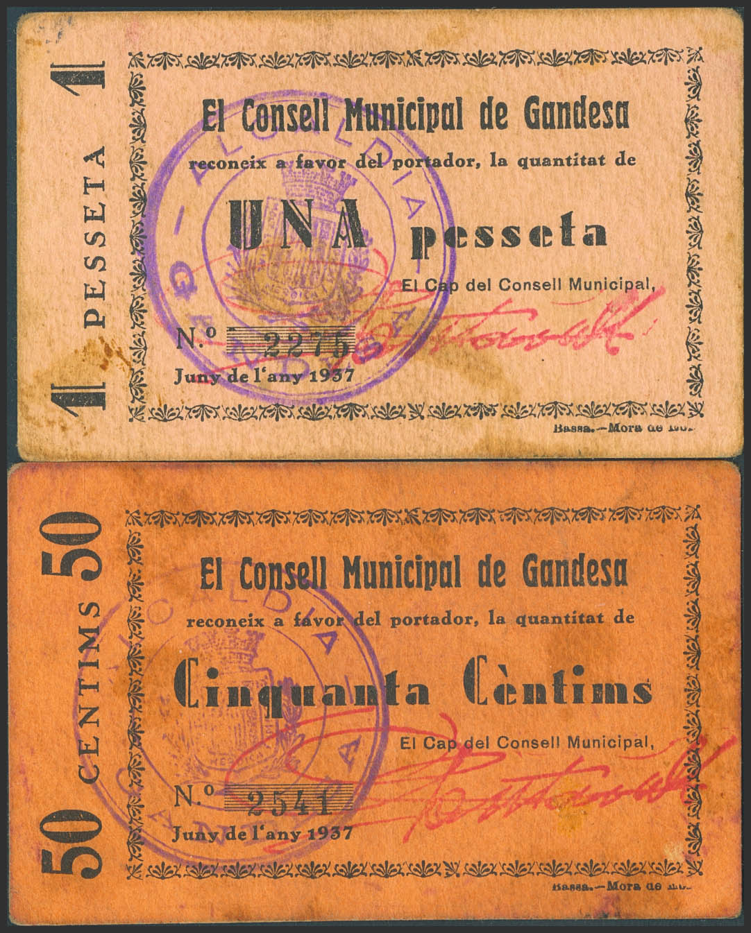 GANDESA (TARRAGONA). 50 Céntimos y 1 Peseta. Junio de 1937. (González: 7959/60). Inusual serie completa. MBC+.