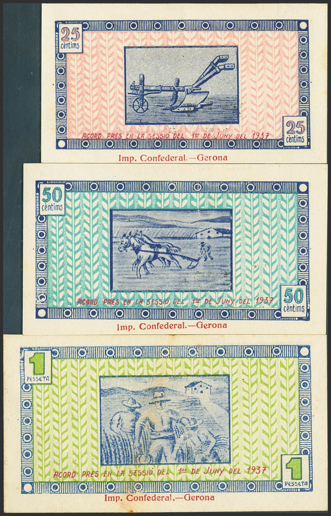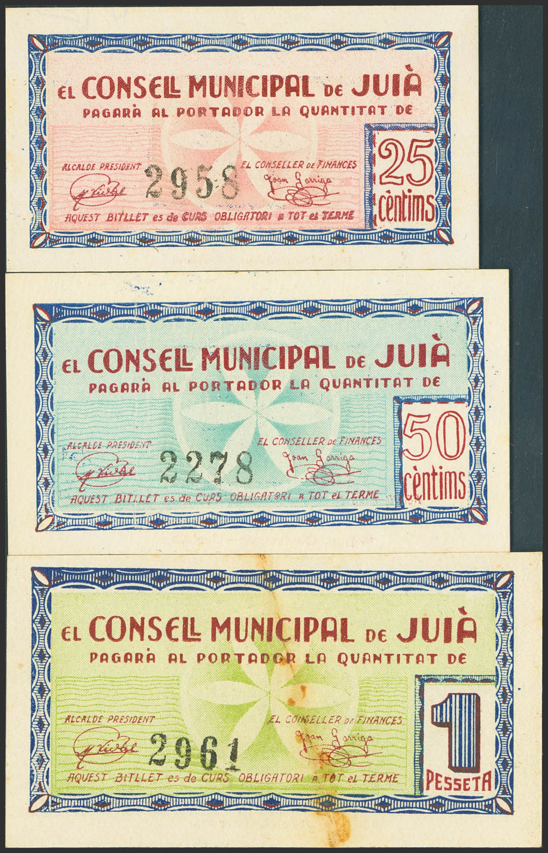 JUIA (GERONA). 25 Céntimos, 50 Céntimos y 1 Peseta. 1 de Junio de 1937. (González: 8287/89). Inusual serie completa. EBC.