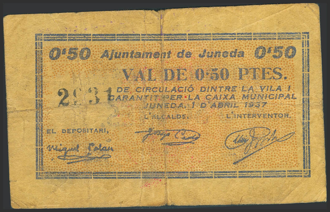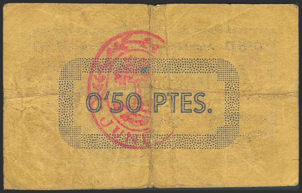 JUNEDA (LERIDA). 50 Céntimos. 1 de Abril de 1937. (González: 8294). Muy raro. BC+.